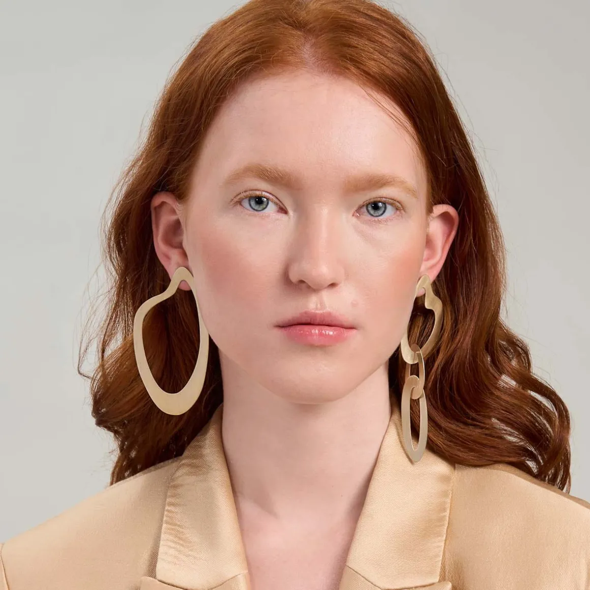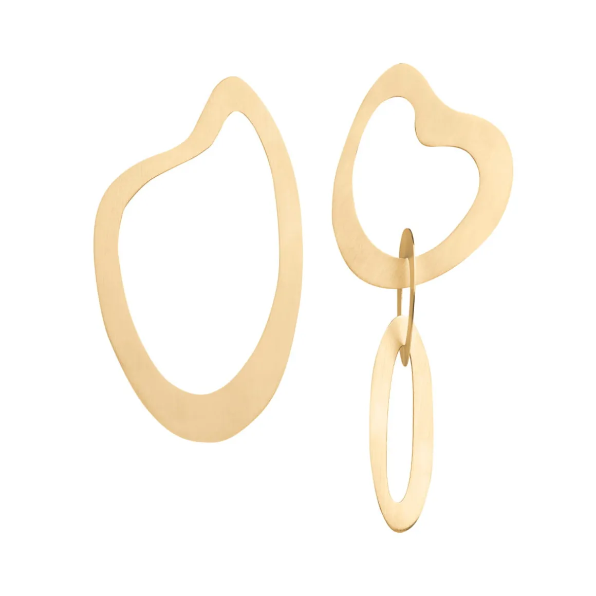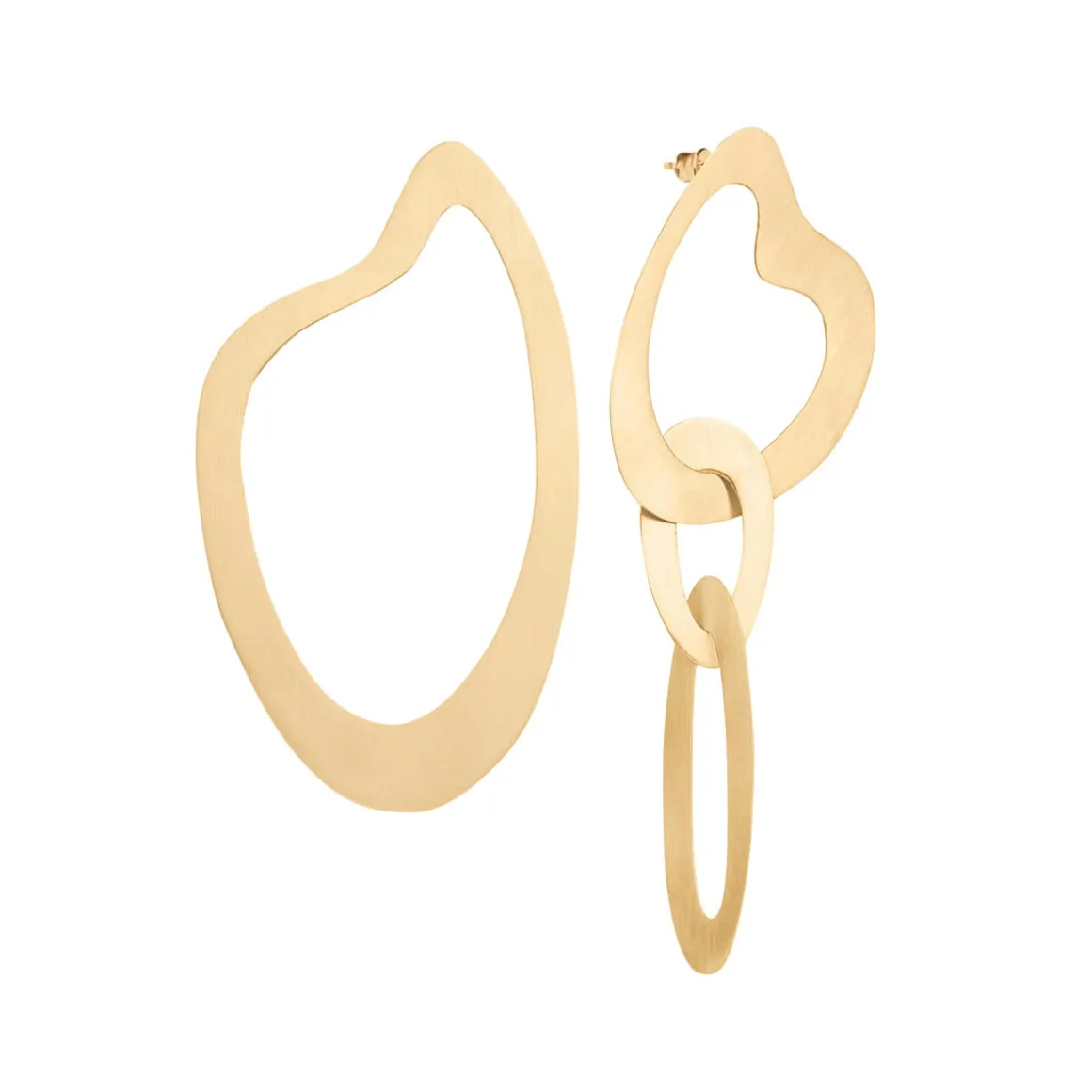 Wiszące kolczyki powstały dzięki ręcznej pracy jubilerów w warsztacie ORSKA. Komplet składa się z dwóch asymetrycznych kolczyków o satynowym wykończeniu. Pierwszy z nich ma formę nieregularnej, płaskiej obręczy w miękkim, finezyjnym kształcie inspirowanym sztuką abstrakcyjną. Drugi kolczyk składa się z trzech połączonych obręczy z pozłacanego mosiądzu. Całość jest lekka i wygodna. Dzięki uniwersalnemu charakterowi i eleganckiej formie kolczyki będą świetnym uzupełnieniem zarówno codziennych, jak i wieczorowych kreacji.