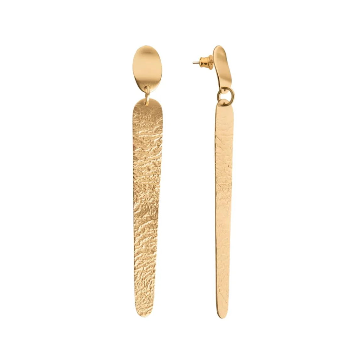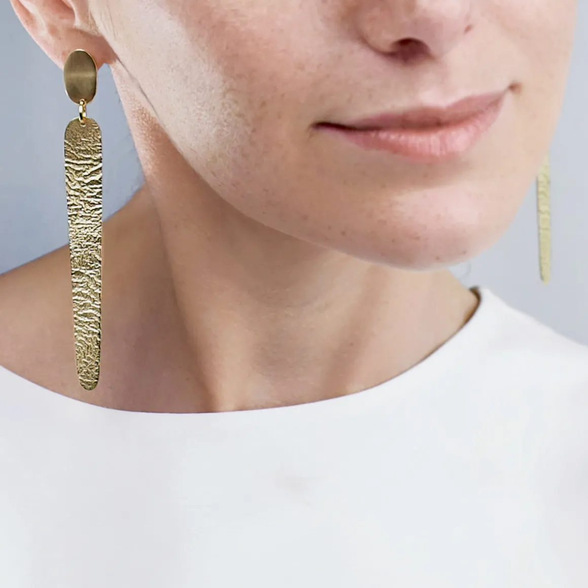 Artystyczne kolczyki na sztyfcie z kolekcji Moon zostały ręcznie wykonane z pozłacanego mosiądzu. Podłużne płaszczyzny, pod wpływem wysokiej temperatury, przyjęły niepowtarzalną strukturę zagięć, która przywodzi na myśl krajobraz księżycowy. Dłuższy element podwieszono do krótszego, o kutej powierzchni, która dodaje całości nowoczesnego sznytu. Wiszące kolczyki posiadają satynowe wykończenie. Oryginalny design najlepiej prezentuje się w towarzystwie innych wzorów z tej samej kolekcji. Pozostaje więc tylko wybrać wielkość konstelacji, aby stworzyć własny Układ Słoneczny.