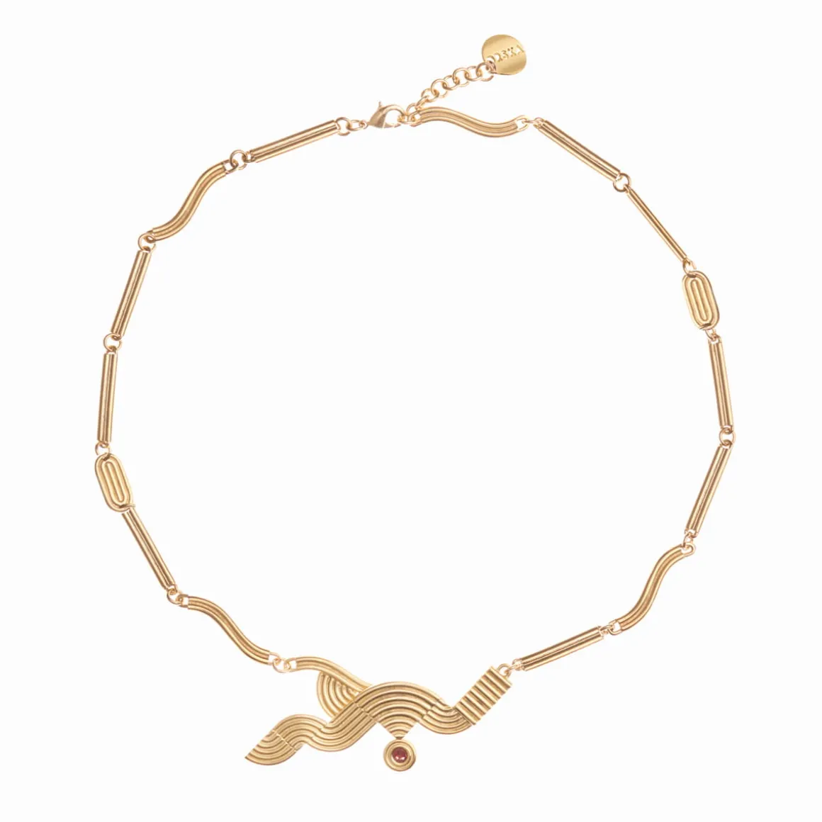 Artystyczny naszyjnik z kryształem został wykonany ręcznie w poznańskiej pracowni. Geometryczne elementy z pozłacanego mosiądzu tworzą oryginalny łańcuch z zapięciem na karabińczyk oraz logo ORSKA. Fantazyjne formy i linearne zdobienie zawieszki oddają symbolikę żywiołów. Alegoria powietrza ma kształt nieustannie pędzącego łuku. Minimalistyczny symbol ziemi to nawiązanie do widoku pól z lotu ptaka. Znak wody zainspirowany został miękką falą morskich pływów. Energię ognia oddaje kryształ w kolorze ciepłej czerwieni. Biżuteria z kolekcji Holos, przedstawiając symboliczną współpracę żywiołów, zachęca byśmy docenili uzupełniającą się istotę natury. Choć naszyjnik doskonale prezentuje się solo, lubi też towarzystwo pozostałych wzorów z kolekcji Holos – asymetryczne kolczyki z czerwonym kryształem lub podwójny, pozłacany pierścionek utworzą wraz z nim duet, obok którego nie da się przejść obojętnie.