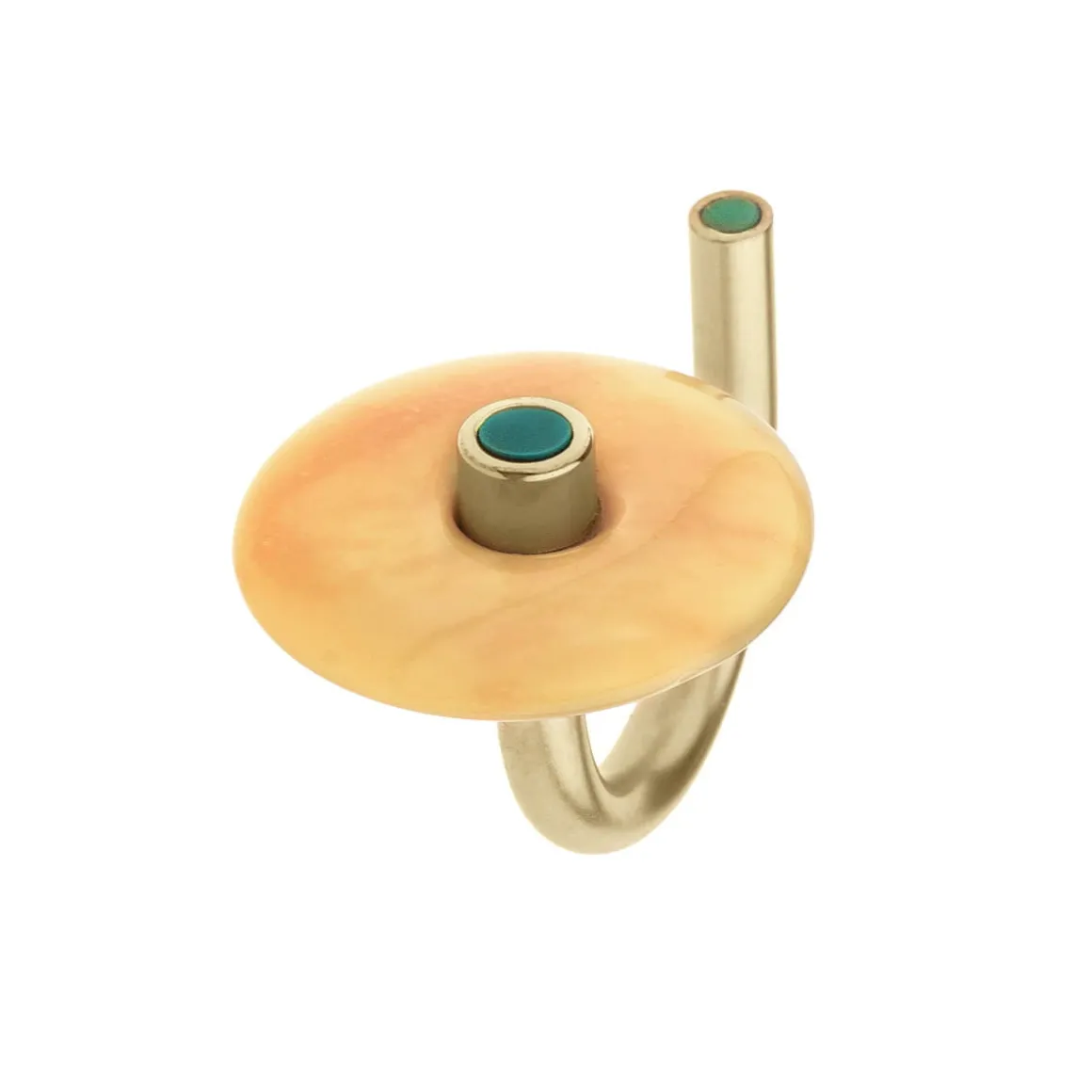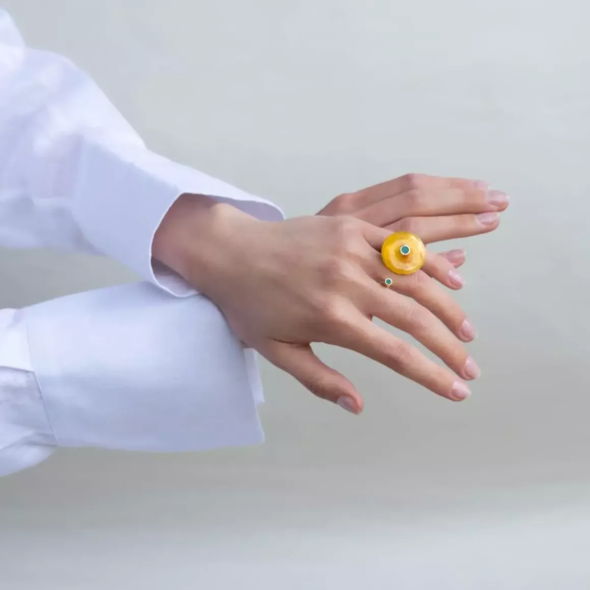 Pierścionek z bursztynem został wykonany ręcznie. Otwartą obrączkę o satynowym wykończeniu zdobi miodowy bursztyn, a na jej końcach umieściła zielone oczka z syntetycznego kamienia Mare. Naturalny kamień został oszlifowany w rodzinnej pracowni na Mierzei Wiślanej. Elegancki pierścionek lubi towarzystwo pozostałych wzorów z kolekcji Baltica – szeroka bransoletka czy wiszące kolczyki z bursztynem wraz z nim utworzą duet, który uzupełni każdą stylizację.