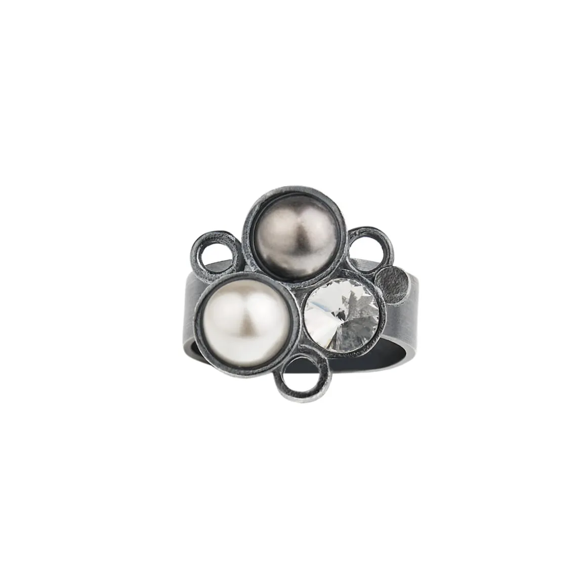 Kolekcja Soda to subtelny flirt klasyki z nowoczesnością. Artystyczny pierścionek został wykonany ręcznie z oksydowanego srebra. Tradycyjną, elegancką obrączkę ubogacono ozdobą wykonaną w technologii druku 3D. Mosiężne bąbelki wypełnione są kryształami i perłami Swarovski Elements, które dodają całości nowoczesnego sznytu. Wyrazista biżuteria będzie idealną ozdobą dla wielbicieli nieoczywistych rozwiązań, spragnionych unikalnych doznań estetycznych.