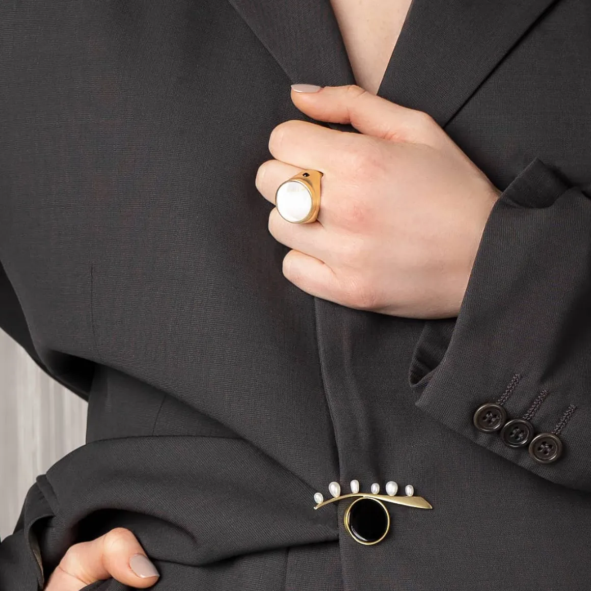 Artystyczny sygnet powstał poprzez osadzenie okrągłej masy perłowej w pozłacanej formie. Pierścionek o satynowej powierzchni ozdobiony został małym kryształem, który umieszczono z boku. Oryginalna biżuteria dzięki geometrycznej formie i połączeniu kontrastujących kolorów ma minimalistyczny charakter. Pierścionek przyciąga uwagę i jest najlepszym dowodem na to, że przeciwieństwa się przyciągają.