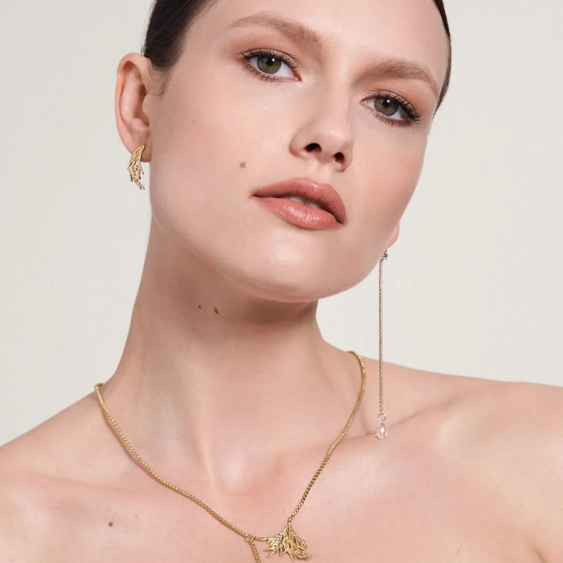 Kolczyki zostały wykonane ręcznie z mosiądzu. Biżuteria w złotym kolorze, kształtem przypomina gałązki rośliny skąpane w blasku porannego słońca. Kolczyki są asymetryczne – jeden z nich jest krótki, do drugiego podwieszono kilkucentymetrowy łańcuszek zakończony kryształem w kształcie kropli. Kryształ ma szlifowane krawędzie w taki sposób by łapał światło i połyskiwał w blasku słońca.