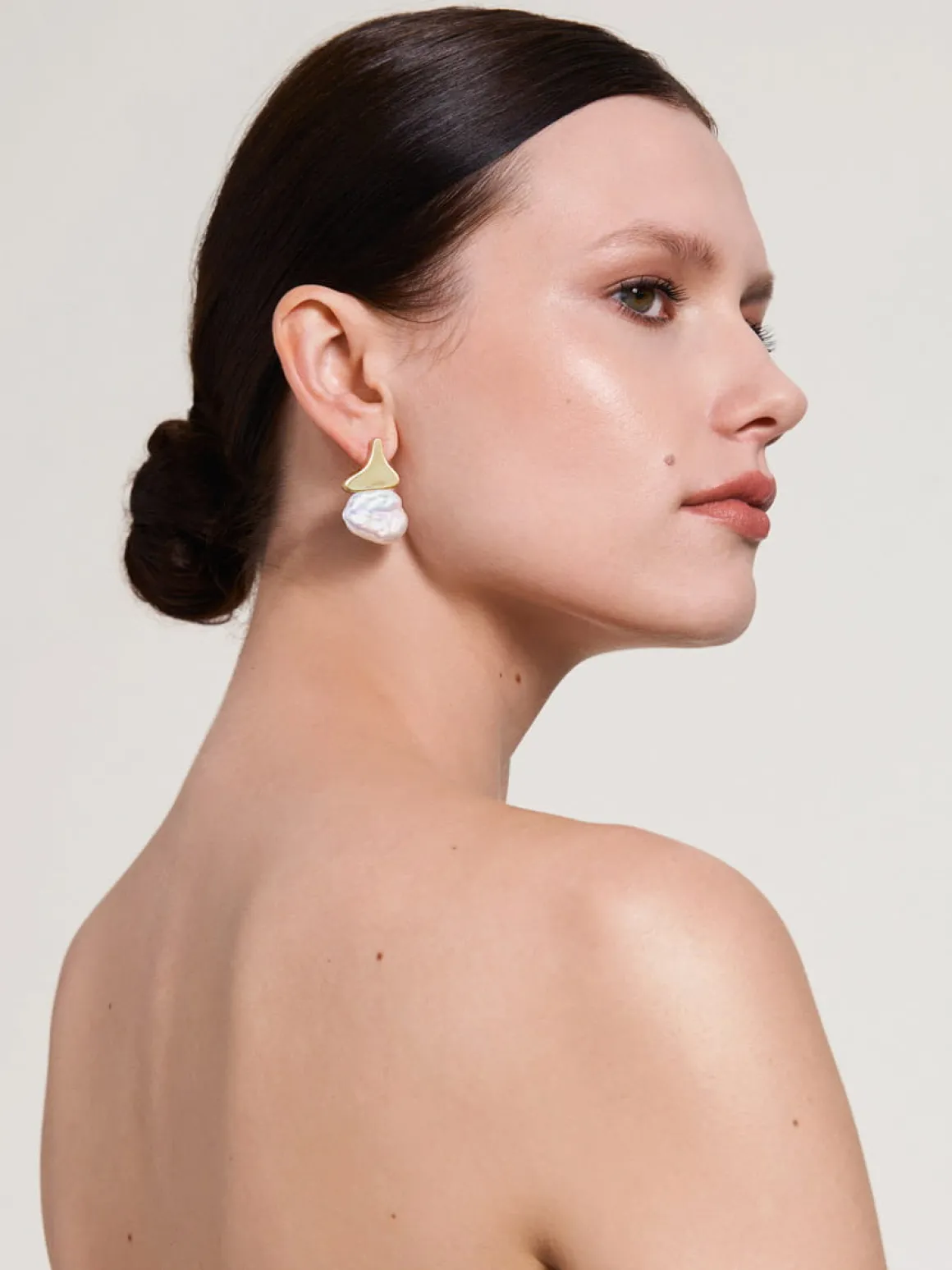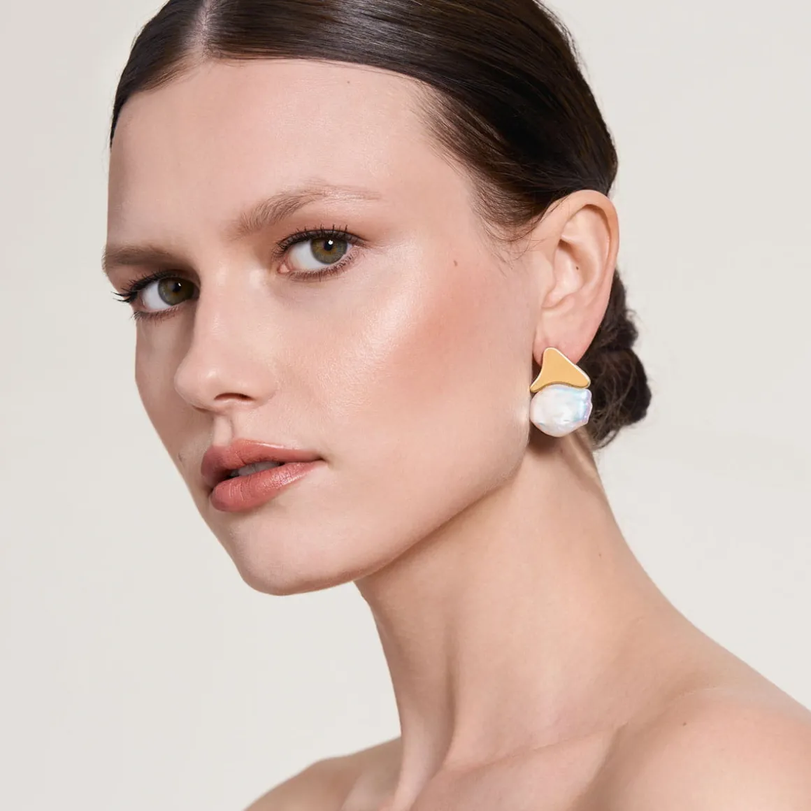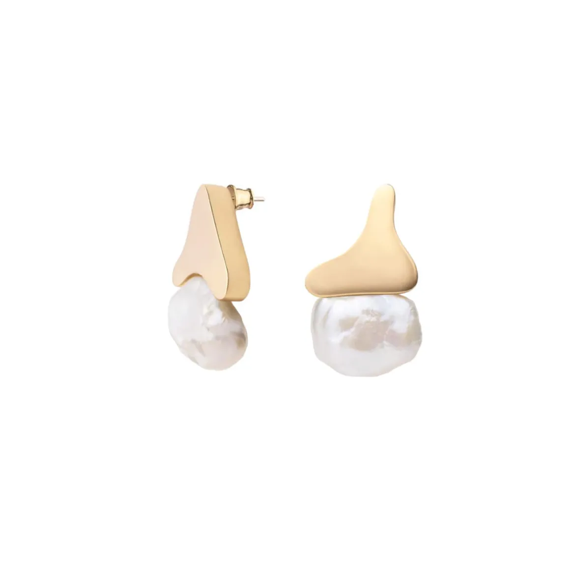 Asymetryczne kolczyki zostały wykonane ręcznie. Miękkie, nieregularne kształty odlane w pozłacanym mosiądzu ozdobione zostały okazałymi perłami słodkowodnymi. Całość utworzyła elegancką kompozycję, przypominającą zdobne ornamenty art nouveau. Kolczyki, mimo dekoracyjnej formy, mają elegancki charakter. Pięknie prezentują się solo, ale lubią być w komplecie! Docenią towarzystwo naszyjnika z dużymi perłami i czarno-białej bransoletki z onyksem.
