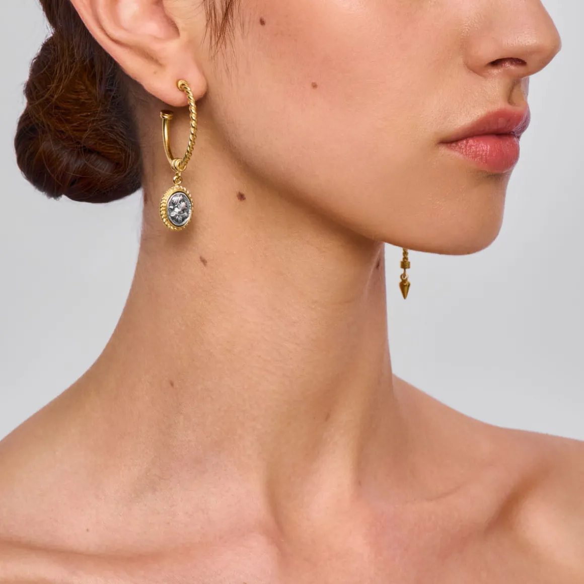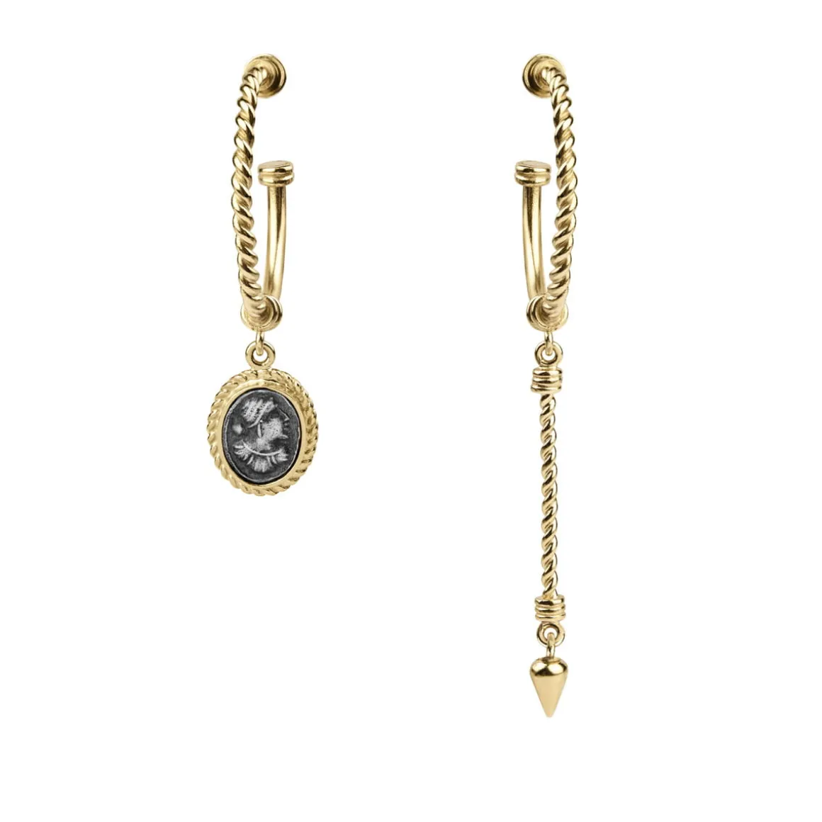 Efektowne, asymetryczne kolczyki wykonane zostały z pozłacanego mosiądzu i uformowane w duże, do połowy plecione koła. Każdy z kolczyków ozdobiony jest inną zawieszką. Do jednego z nich został przytwierdzony fragment medalionu ze srebra oksydowanego, przedstawiający figurę króla. Medalion zanurzony jest w pozłacanej, spiralnie zdobionej oprawie. Drugi kolczyk z pary ma podwieszoną smukłą strzałę. W biżuterii z kolekcji Semios ciepły, złoty kolor mosiądzu odważnie kontrastuje z oksydowanym srebrem tworząc kompozycję, która przyciąga spojrzenia i kradnie komplementy.
