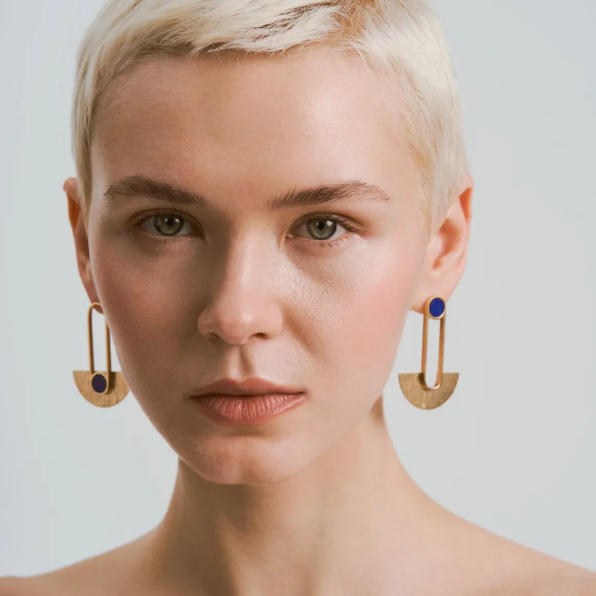 Asymetryczne kolczyki z kolekcji Orini wykonaliśmy w naszej pracowni jubilerskiej z mosiądzu, który pokryliśmy ciepłym złoceniem, nadając im eleganckiego blasku. Proste, geometryczne kształty – z których zbudowaliśmy kolczyki – inspirowane są księżycem i jego fazami – od pełni, aż po nów. Ręcznie wykonane półokrągłe elementy pierwszej i trzeciej kwadry mają szczotkowaną powierzchnię. Przełamaliśmy ją owalem nowiu o gładkiej, satynowej powierzchni. Każdy z kolczyków zdobi osadzony asymetrycznie ultramarynowy kamień lapis lazuli w kształcie księżycowej pełni. Kontrast ze złocistym blaskiem metalu tworzy przyciągającą uwagę kompozycję.