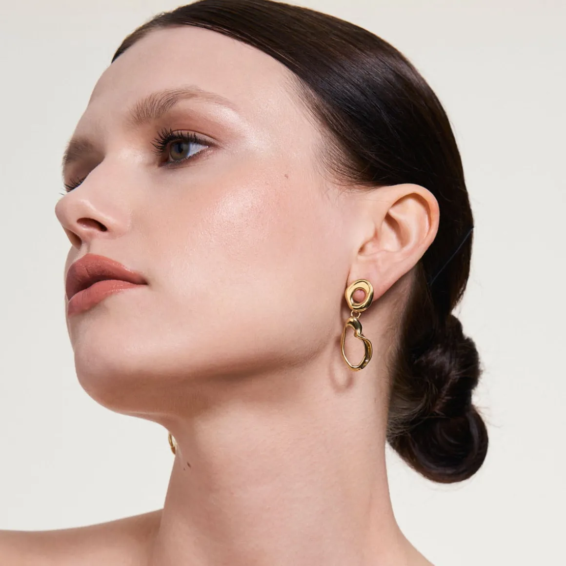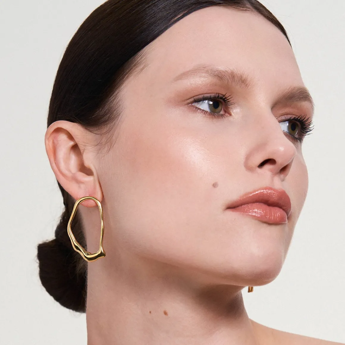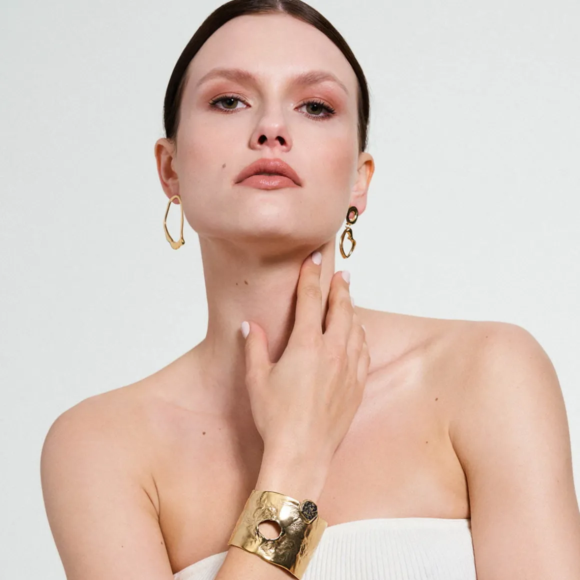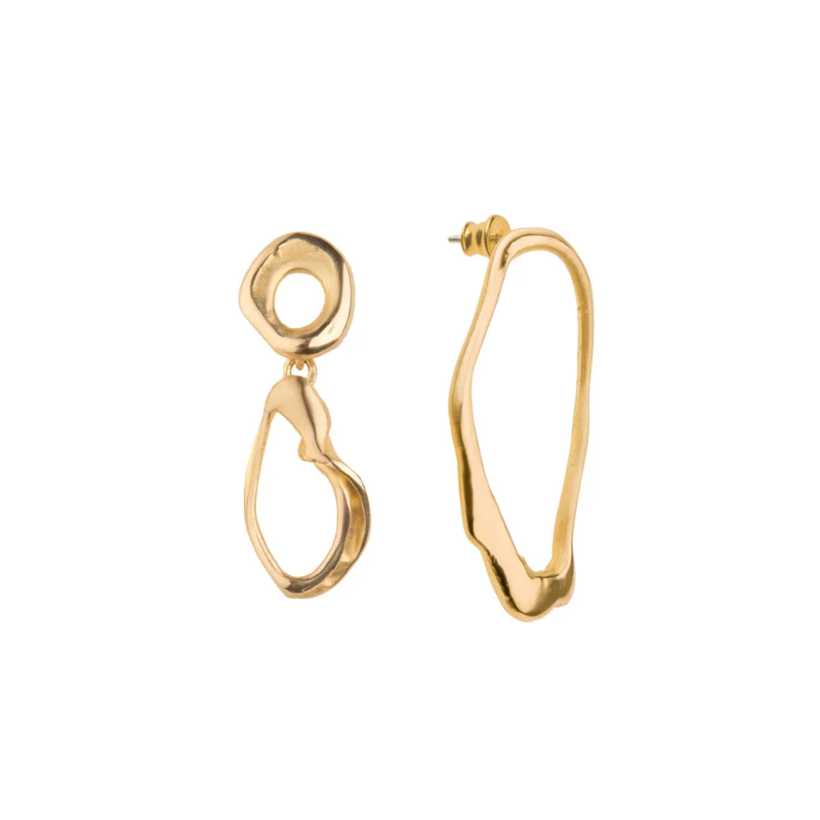 Niesymetryczne kolczyki na sztyfcie z kolekcji New Stone zostały ręcznie wykonane z pozłacanego mosiądzu. Okręgi o nieregularnym kształcie oraz połączenie połysku z matem utworzyły interesującą formę, która przyciąga uwagę. Surowa, nieidealna faktura mosiądzu przywodzi na myśl skojarzenia naturalnych, chropowatych powierzchni skalnych, co podkreśla niebanalny charakter całości. Kolczyki sprawdzą się zarówno w casualowych jak i wieczorowych stylizacjach.