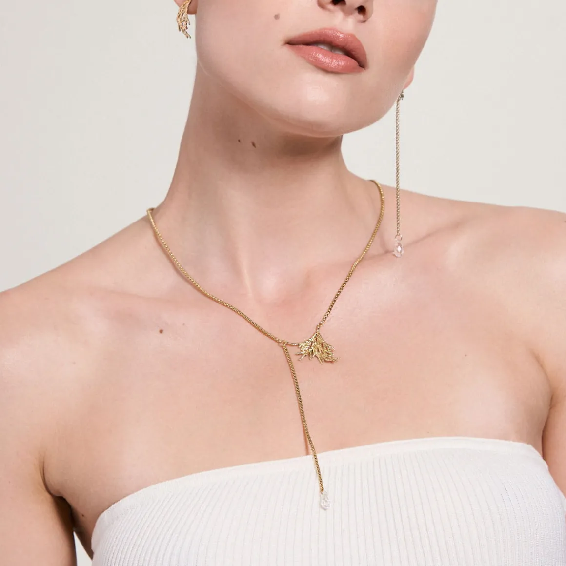 Delikatny naszyjnik został stworzony ręcznie w pracowni ORSKA. Jubilerzy wiernie przenieśli charakterystyczną fakturę i ażurową formę naturalnych gałązek do świata biżuterii. Na delikatnym łańcuszku zawieszony został fragment rośliny, wyglądający jak żywa gałązka zanurzona w złotym metalu. Przedłużenie łańcuszka zdobi transparentny kryształ w kształcie kropli. Całość tworzy asymetryczną, intrygującą kompozycję. Fasetowana kropla mieni się w słońcu rozświetlając każdą stylizację.