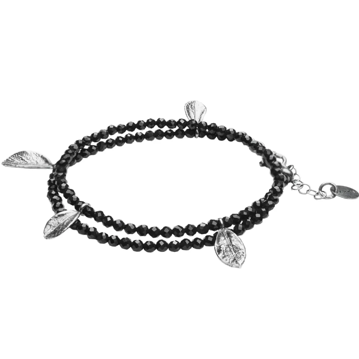 Artystyczna bransoletka z kolekcji Bery została ręcznie wykonana z kamieni naturalnych, które dzięki połączeniu utworzyły podwójny sznur miękko oplatający nadgarstek. Całość przyozdabiają grafitowe zawieszki ze srebra w kształcie liści bukszpanu rzeczywistej wielkości. Bardzo delikatna i kobieca biżuteria w romantycznym stylu będzie idealnym wyborem dla osób kochających naturę, które nieustannie czerpią z niej siłę i inspirację.