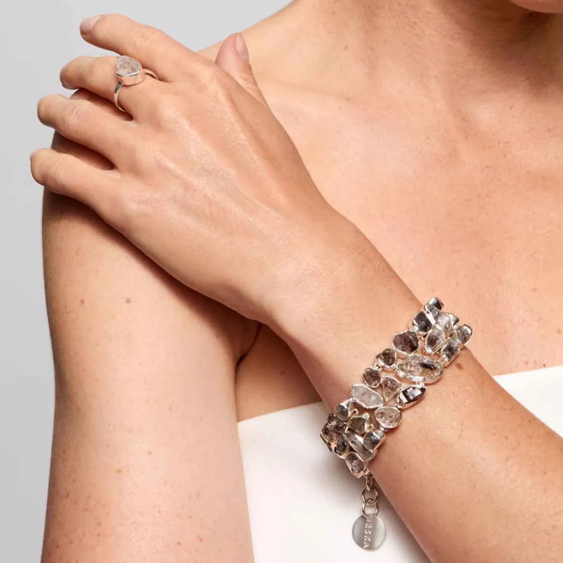 Efektowna bransoletka powstała z połączenia łupanych fragmentów kryształów górskich tzw. herkimerów. Ten kamień o transparentnej barwie zachwyca naturalnym szlifem, nieregularną formą i barwnymi inkluzjami, które dodają mu charakteru. Kamienne bryłki zostały indywidualnie oprawione w srebro, by podkreślić nieregularny, pierwotny kształt kamienia. To wyjątkowe podejście wyróżnia kolekcję, bo w jubilerstwie zazwyczaj stosuje się ustandaryzowane oprawki. Cała kompozycja zakończona jest przedłużką z podwieszanym logo ORSKA, która umożliwia regulację długości bransoletki.