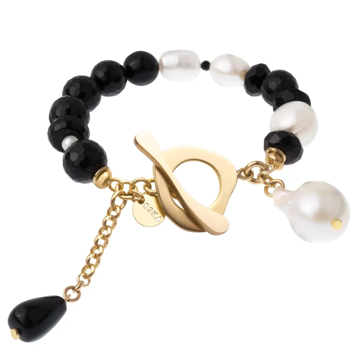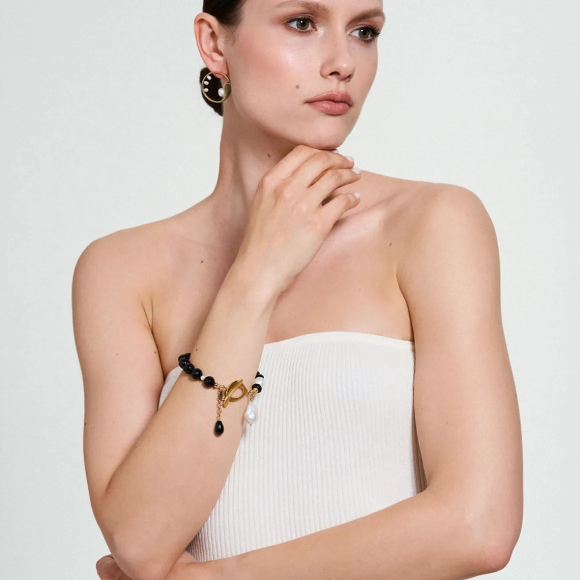 Artystyczna bransoletka powstała poprzez połączenie nieregularnych pereł słodkowodnych i fasetowanych onyksów o różnych kształtach. Całość dopełnia krótki łańcuszek zakończony onyksem oraz zapięcie na ozdobny skobelek, którego miękkie linie przywodzą na myśl malarskie zdobienia art nouveau. Czarno – biała biżuteria pasuje zarówno do wieczorowej sukienki, jak i biznesowego dress codu. Kontrastowe połączenie przyciąga uwagę i jest najlepszym dowodem na to, że przeciwieństwa się przyciągają.