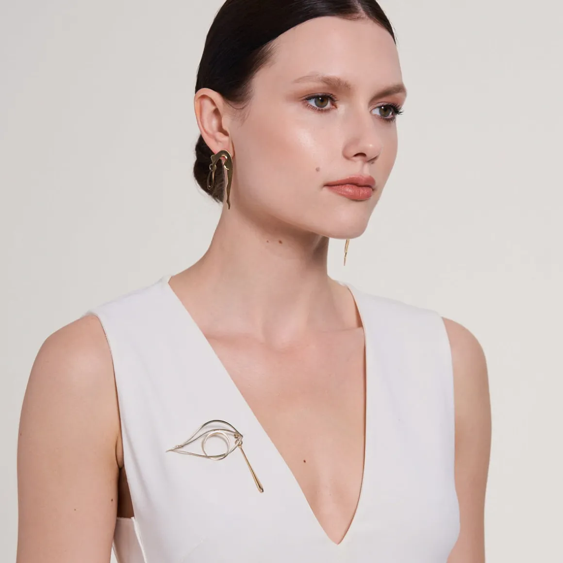 Biżuteria z kolekcji Body projektu Anny Orskiej wymaga otwartości, tak jak w rzeczywistości wymaga jej ciało, którego piękno tkwi w różnorodności. Inspiracja rzadko docenianą urodą jego bardzo funkcjonalnych fragmentów znalazła swoje ujście w hiperrealistycznych formach. Broszka w kształcie oka została ozdobiona mosiężną łzą. Całość została wykonana ręcznie z pozłacanego mosiądzu.