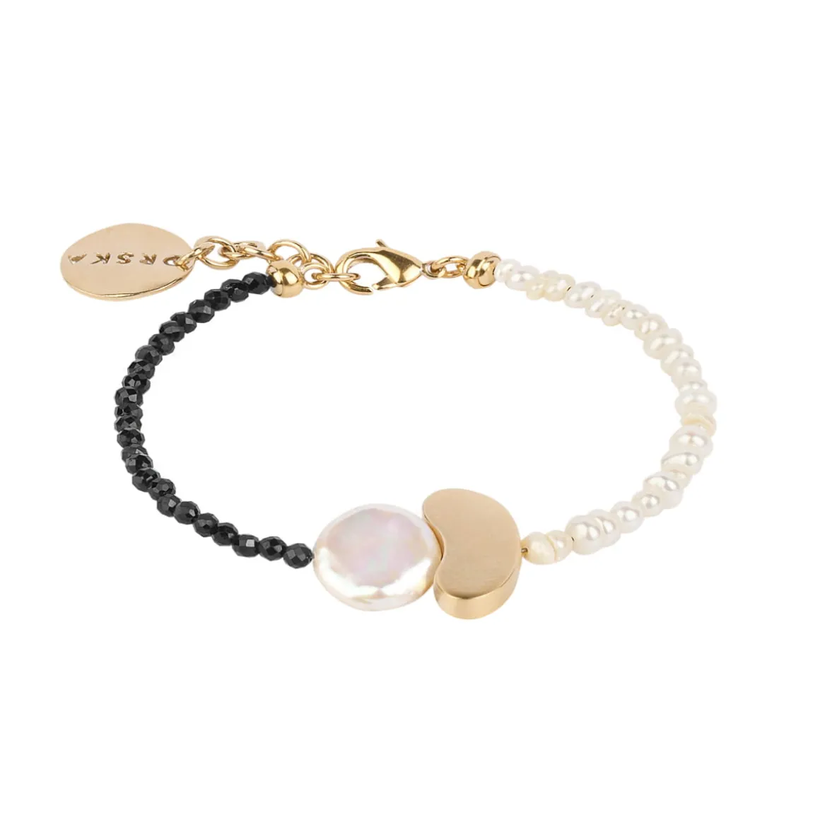 Delikatna bransoletka powstała poprzez połączenie nieregularnych pereł słodkowodnych i drobnych onyksów. Biżuteria ozdobiona została pozłacanym elementem o miękkim, abstrakcyjnym kształcie, który został połączony z większą perłą. Czarno – biała bransoletka ma uniwersalny charakter, dzięki czemu dobrze prezentować się będzie zarówno w towarzystwie wieczorowej sukienki, jak i białej koszuli czy codziennej bluzki.