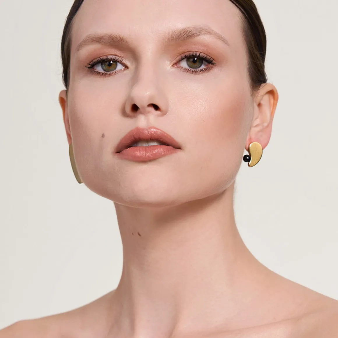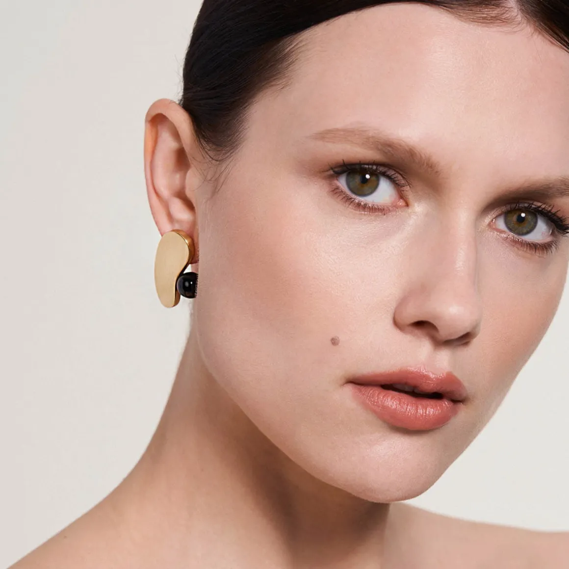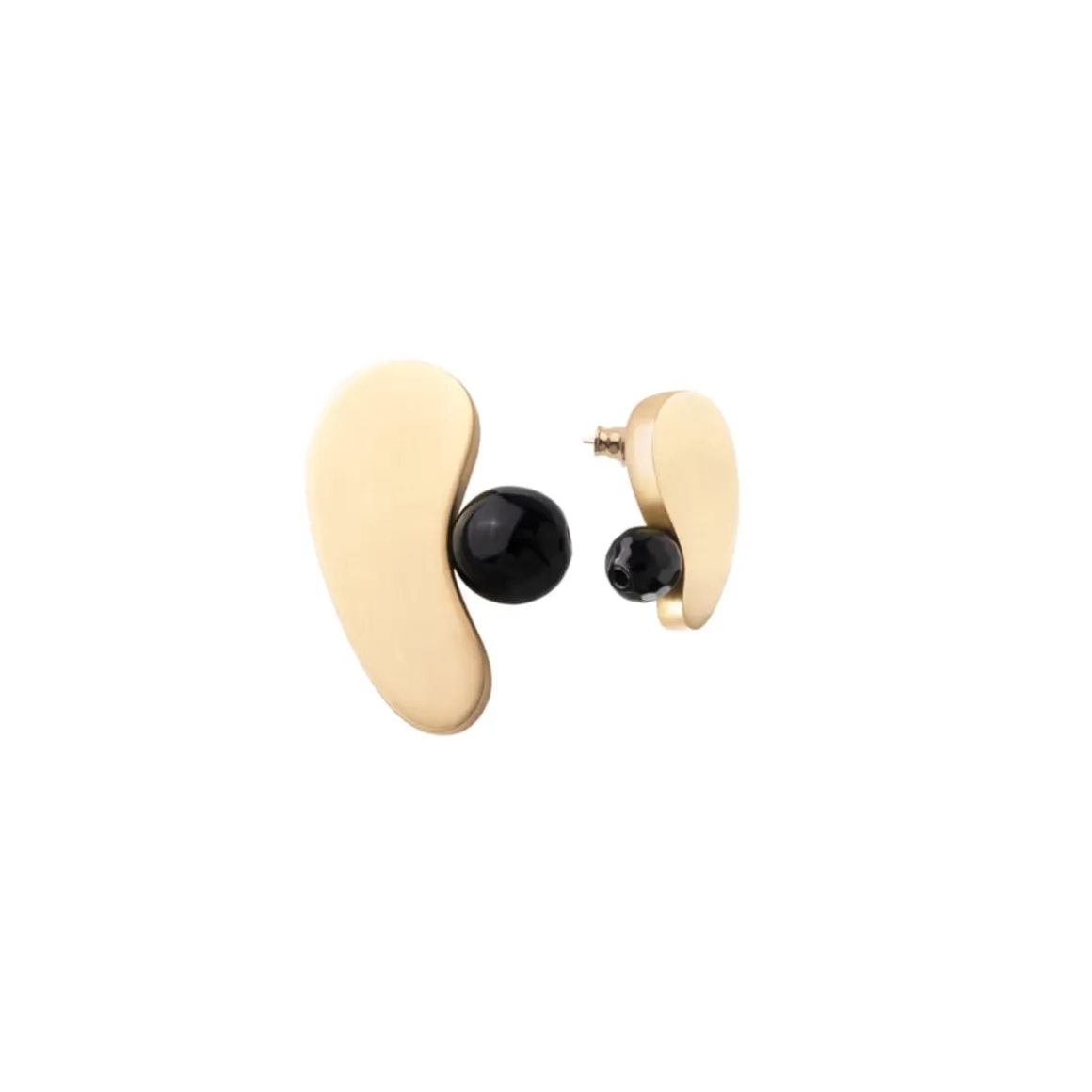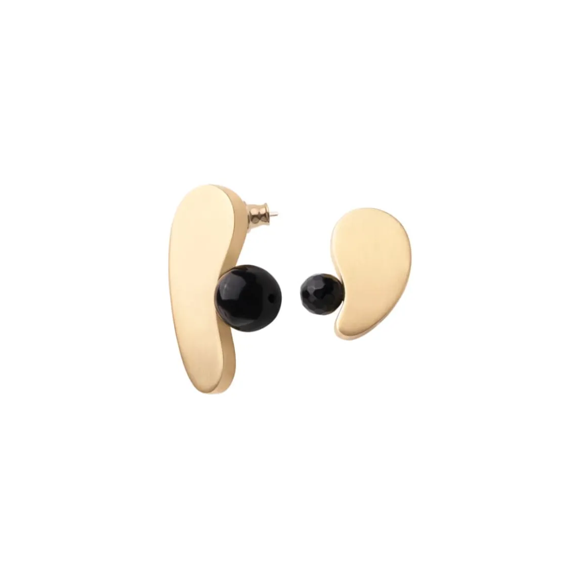 Delikatne kolczyki zostały wykonane ręcznie. Miękkie, nieregularne kształty odlane w pozłacanym mosiądzu ozdobione zostały okrągłymi onyksami. Sztyfty wykonano ze srebra. Całość utworzyła kompozycję, przypominającą zdobne ornamenty art nouveau. Biżuteria, mimo niewielkich rozmiarów, jest elegancka i bardzo zdobna. Kolczyki wraz z bransoletką z onyksami i perłami utworzą duet, który skradnie mnóstw komplementów.