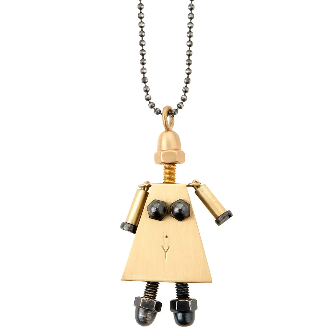 Zawieszka robocik została wykonana ręcznie przez jubilerów ORSKA. Składa się z mosiężnych elementów w złotym i grafitowym kolorze. Foremny tułów w kształcie sukienki ozdobiono ciemnymi śrubkami naśladującymi biust i nogi oraz głowę. Ramiona robota umieszczone zostały na ogniwach, dzięki temu można nimi poruszać, natomiast na dłoniach Pani Robot można zawiesić własne charmsy. Kulkowy łańcuszek w grafitowym kolorze nawiązuje do militarnych nieśmiertelników. Naszyjnik posiada również kilkucentymetrową przedłużkę, zakończoną logiem ORSKA.