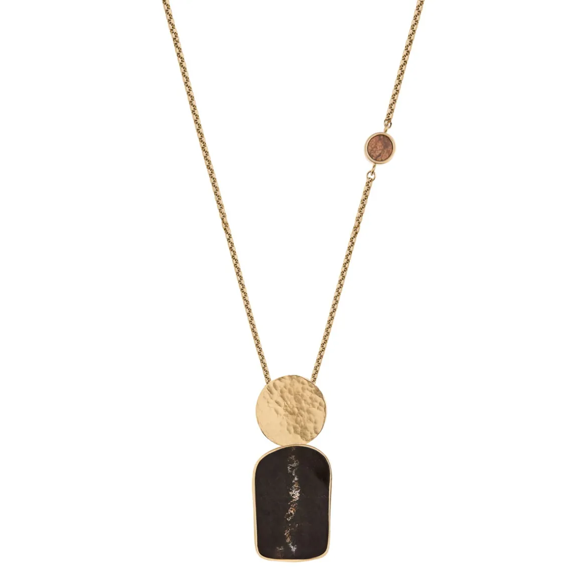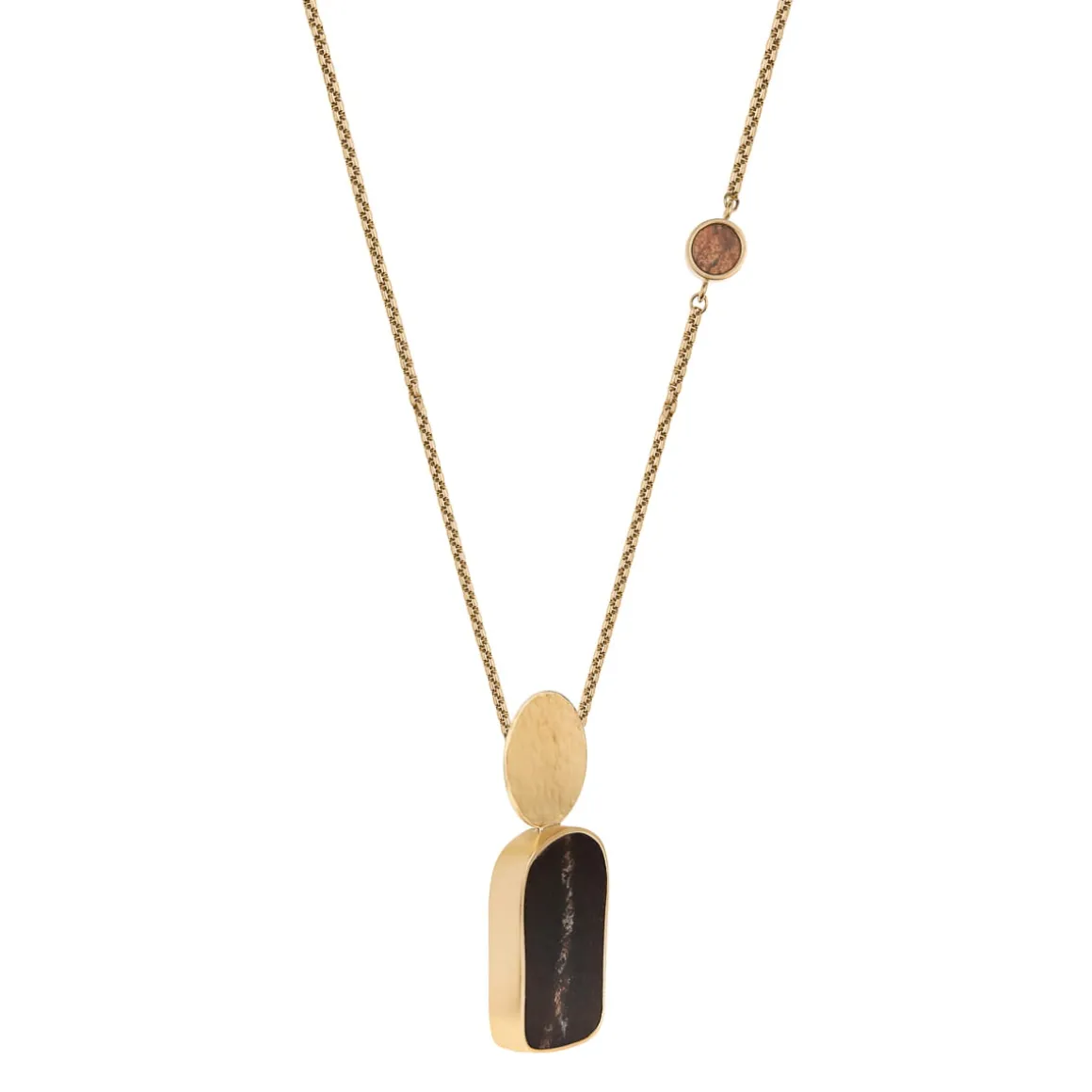 Naszyjnik z kolekcji Monumental został wykonany ręcznie w pracowni ORSKA. Powstał poprzez zestawienie okrągłego, pozłacanego elementu z dwoma fragmentami ceramiki: poziomej zawieszki w kolorze brązowym oraz pionowego wisiora z czarną ceramiką osadzonych na eleganckim łańcuszku o splocie kostki. Geometryczne formy podkreślają unikatowość i naturalne piękno surowca, a kuta powierzchnia metalu nadaje całości świeżości i rockowego charakteru. Naszyjnik wykończono kilkunastocentymetrową przedłużką, zapięciem na karabińczyk oraz okrągłym logo ORSKA. Choć naszyjnik doskonale prezentuje się solo, lubi też towarzystwo pozostałych wzorów z kolekcji Monumental– szeroka bransoletka lub ceramiczny pin utworzą wraz z nim duet, obok którego nie da się przejść obojętnie.