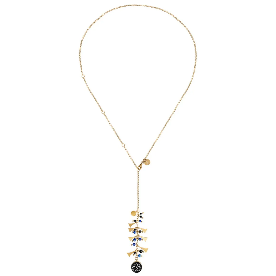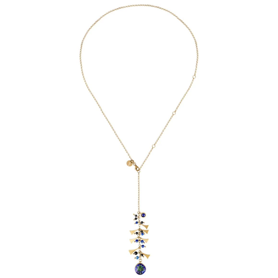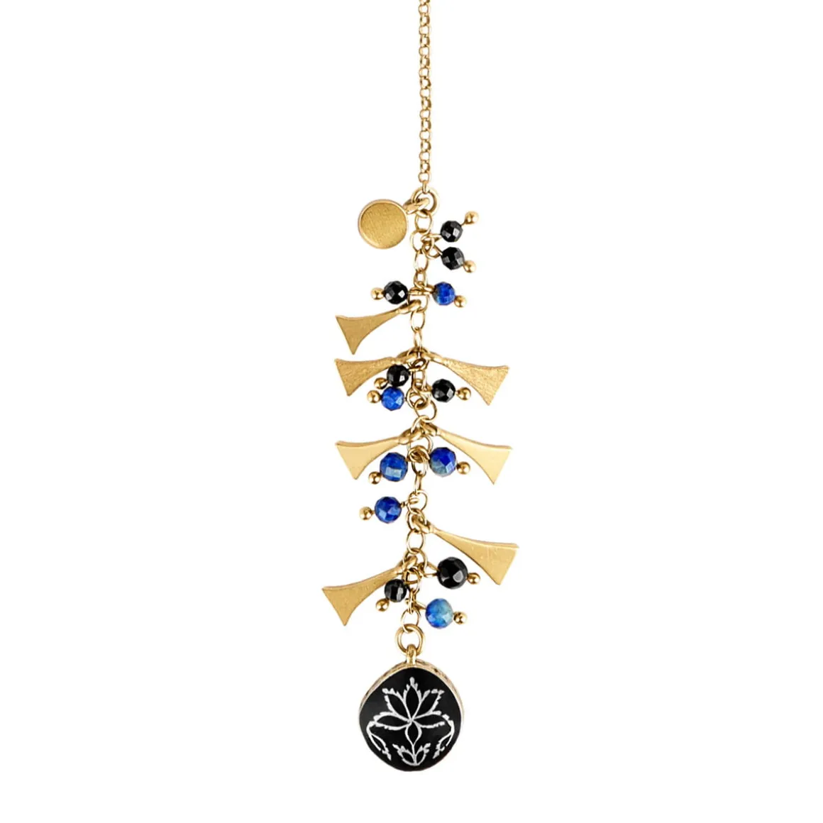Długi łańcuch z pozłacanego srebra ozdobiono licznymi, drobnymi zawieszkami z fasetowanych onyksów, lapisów lazuli oraz geometrycznych elementów z pozłacanego mosiądzu, które tworzą bogatą i dynamiczną kompozycję. W górnej części zawieszki umieszczono okrągły element z fasetowanym kundan glass w odcieniu indygo – wysokiej jakości indyjskim szkłem, które efektownie rozprasza światło przy każdym ruchu. Dolną część wieńczy największa, emaliowana zawieszka minakari, bogato zdobiona motywami florystycznymi. Z jednej strony, dzięki ozdobom wykonanym z czarnej emalii, jest subtelna, elegancka i stonowana. Z drugiej zachwyca niebiesko-zielonymi ornamentami, w których widoczne są charakterystyczne dla techniki minakari warstwowość i delikatne przejścia barw. Brzegi zawieszki dopełnia pas czarnej emalii, podkreślający jej dekoracyjny charakter.