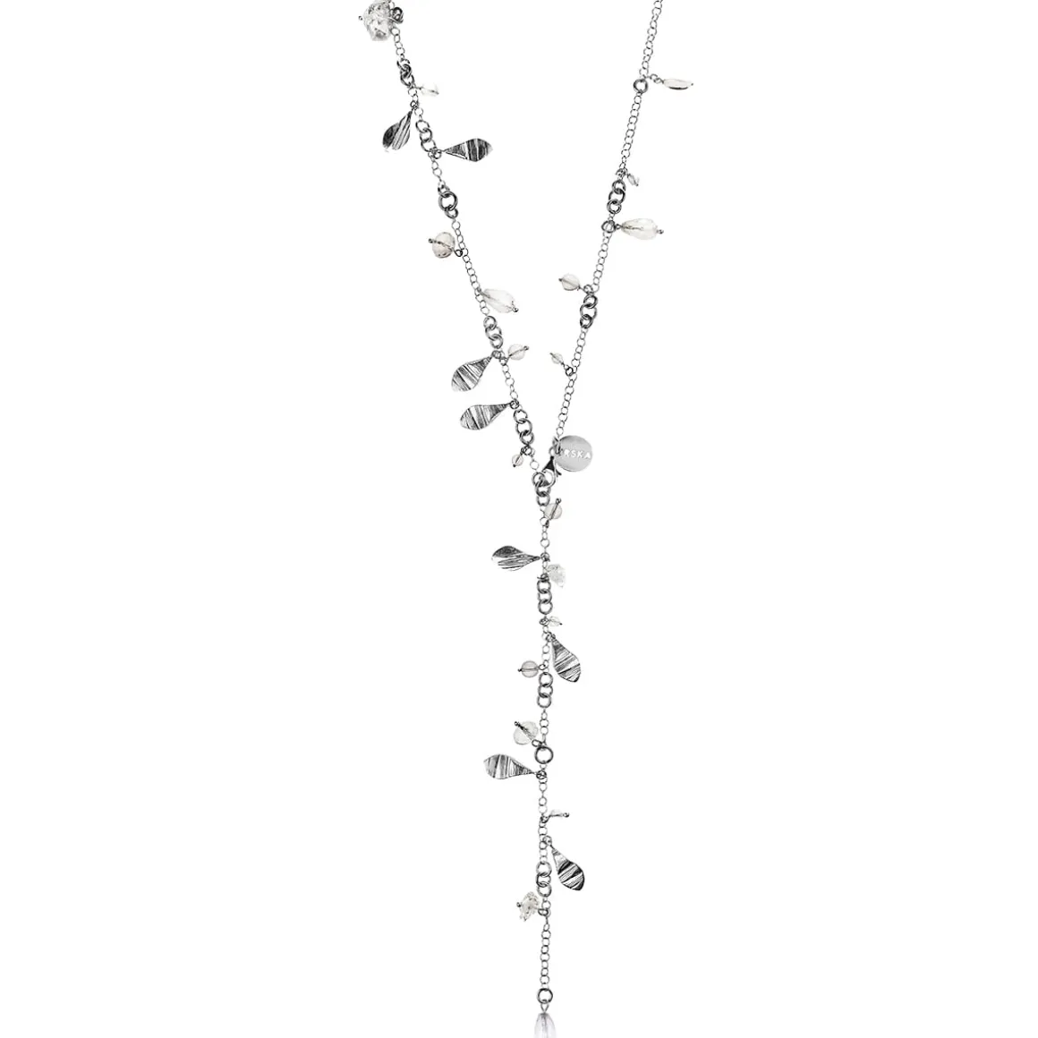 Długi naszyjnik z kolekcji Aurora został wykonany ręcznie ze srebra próby 925. Drobne oczka łańcuszka przeplatają się z nieco większymi oczkami tworząc ciekawą, asymetryczną kompozycję, dodatkowo ozdobioną kryształami górskimi oraz herkimerami. Transparentne korale przyciągają uwagę diamentowym blaskiem, a niekiedy także barwnymi inkluzjami, które czynią każdy egzemplarz unikatowym. Całość dodatkowo ozdobiona jest srebrnymi zawieszkami o nieregularnej fakturze inspirowanej surowym, łupanym turmalinem, które przywołują skojarzenia z dzikością natury i jej pierwotnym pięknem. Ta biżuteria łączy subtelność i surowość – symbolizuje spotkanie światła zaklętego w kryształach z siłą ziemi, utrwaloną w fakturze srebra.