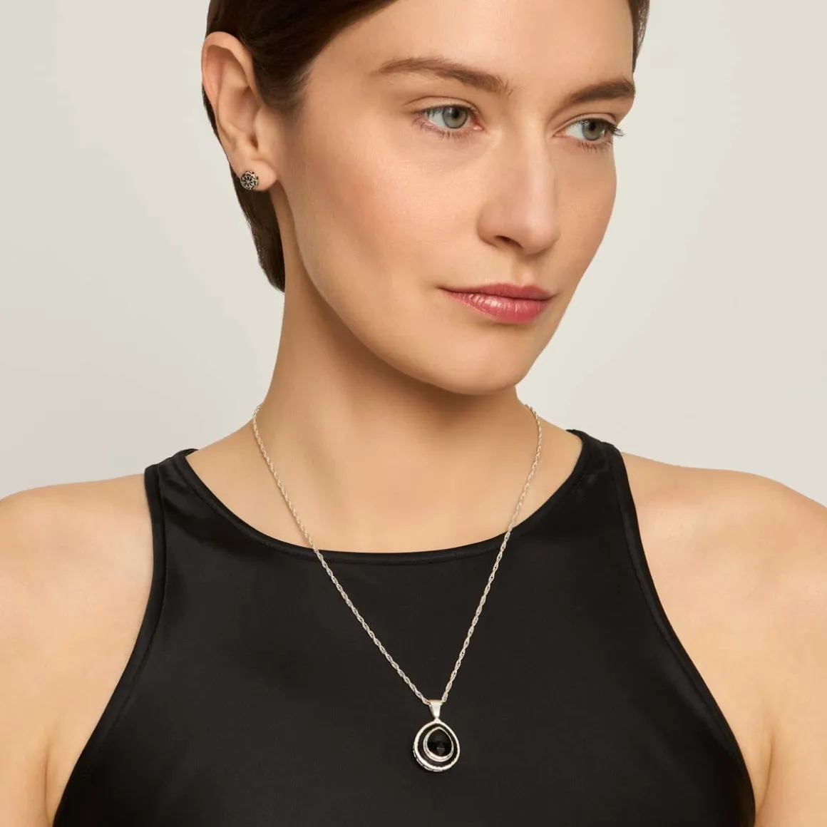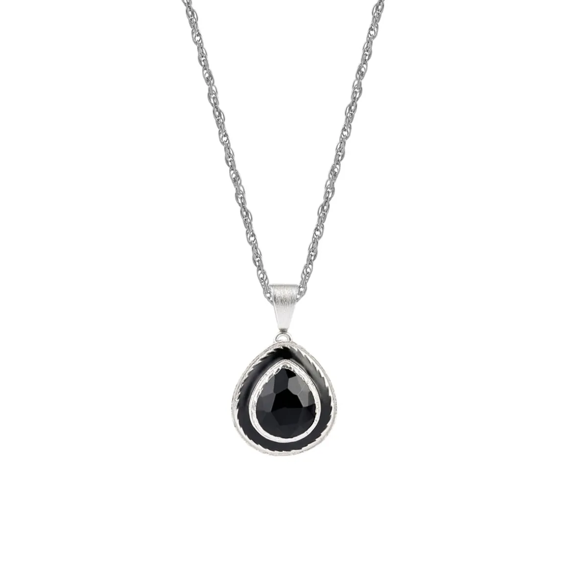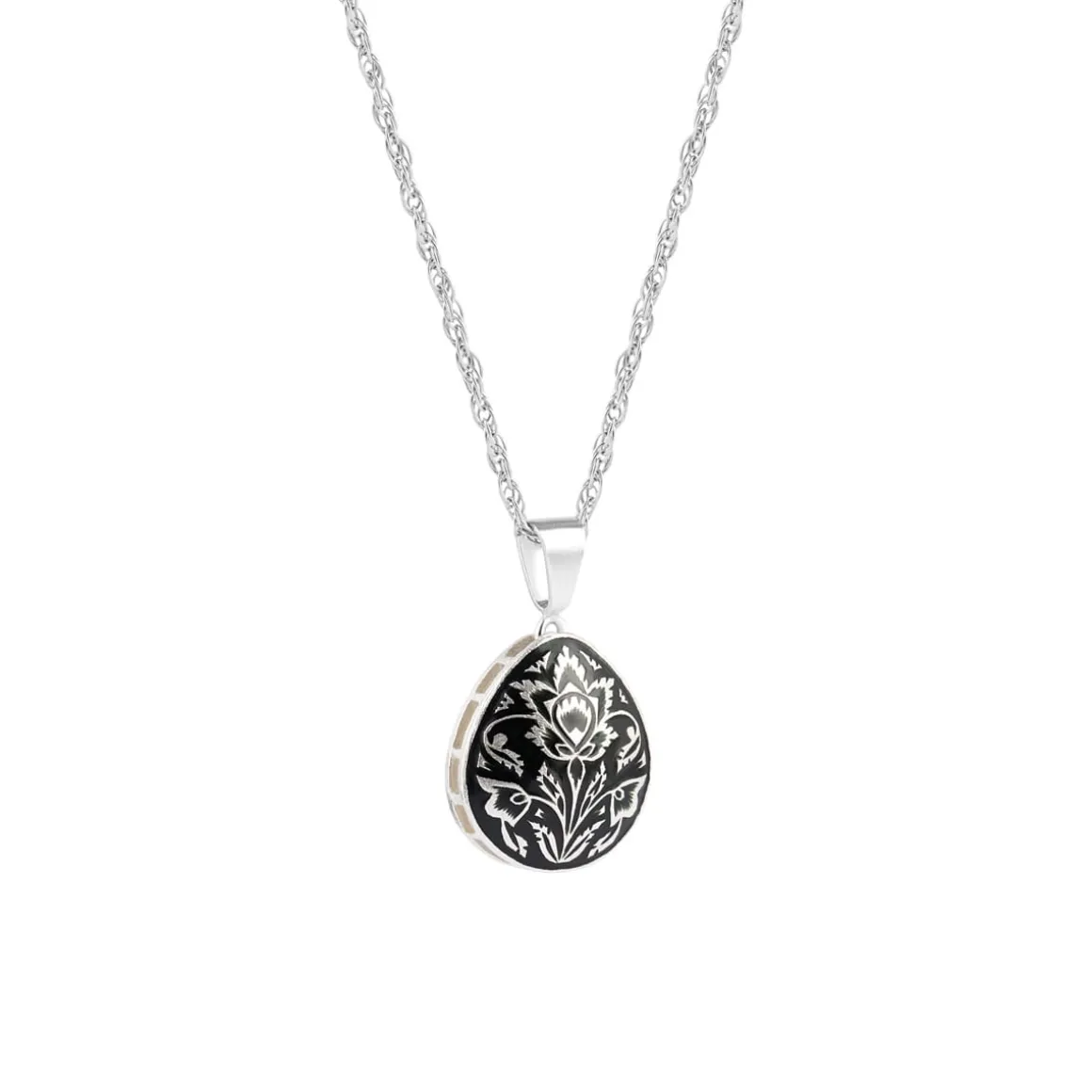 Długi naszyjnik z jasnego srebra na łańcuszku o spiralnym splocie zdobi zawieszka w kształcie łezki. Zawieszka jest dwustronna – z jednej strony zdobi ją centrycznie ułożone czarne kundan glass, czyli tradycyjne indyjskie szkło, otoczone zdobieniami ze srebra oraz czarnej emalii. To strona elegancka, stonowana, pełna tajemnicy. Druga strona zawieszki odsłania misterne floralne zdobienia wykonane ręcznie przez lokalnych rzemieślników: czarno-srebrne ornamenty roślinne. Naszyjnik można zapiąć na kilku wysokościach. Biżuteria dodatkowo posiada przedłużkę, zakończoną niewielką zawieszką obustronnie zdobioną roślinnymi wzorami.