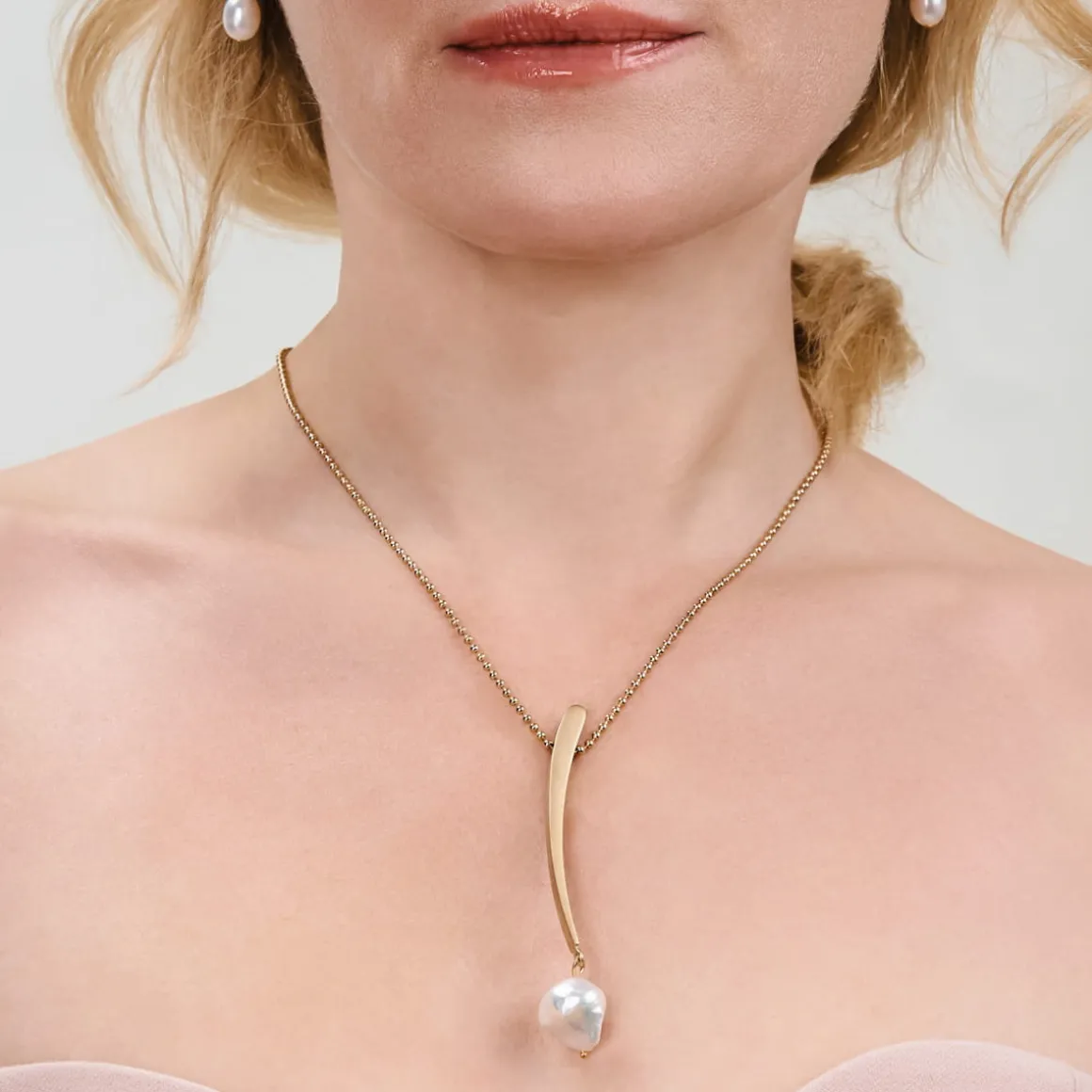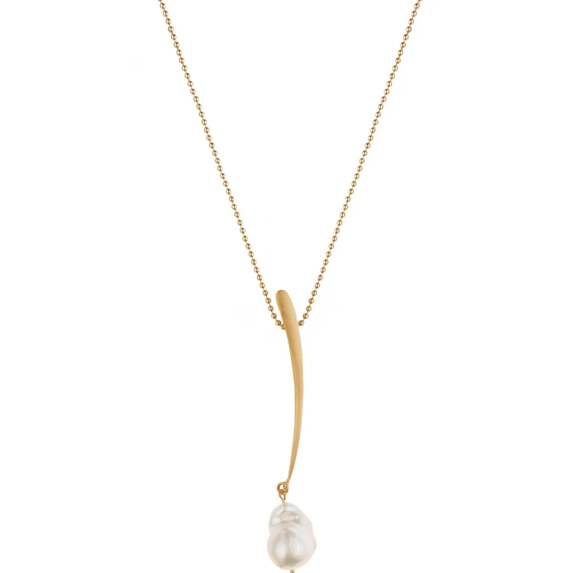 Delikatny naszyjnik został wykonany ręcznie. Kulkowy łańcuszek ozdobiony został oksydowaną zawieszką o miękkim, podłużnym kształcie, do której podwieszono nieregularną perłę słodkowodną. Naszyjnik jest eleganckim dodatkiem, który ozdobi biznesowy dress code. Ale sprawdzi się także w codziennych stylizacjach. W towarzystwie wiszących kolczyków czy bransoletki z onyksami i perłami skradnie wszystkie spojrzenia.