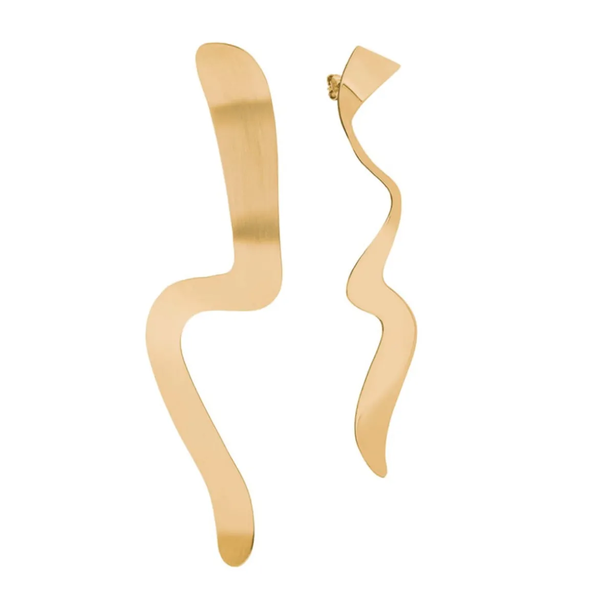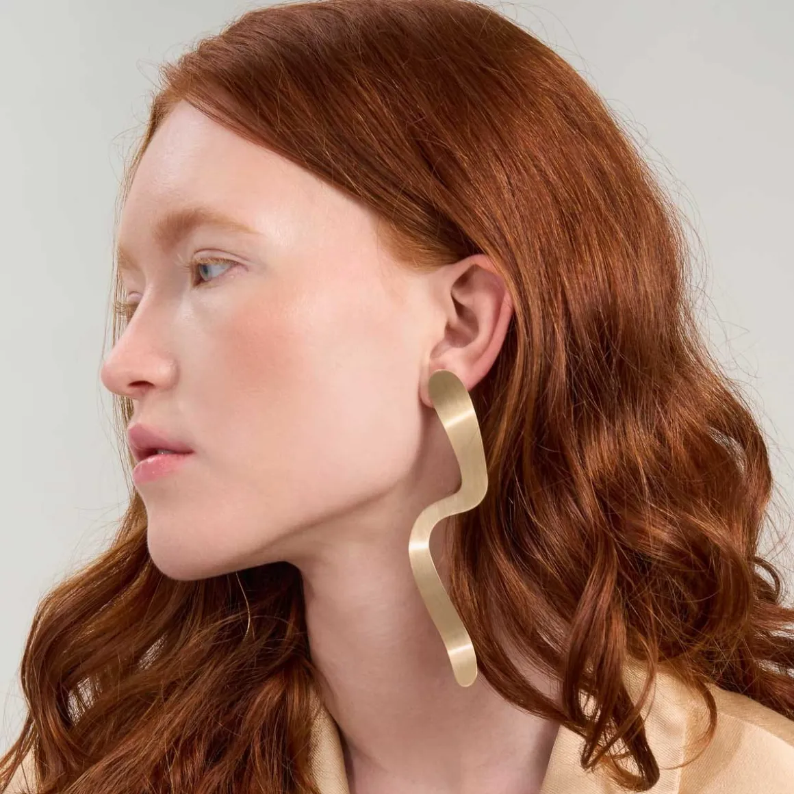 Długie, wiszące kolczyki na sztyfcie zostały wykonane ręcznie w naszej pracowni z pozłacanego mosiądzu. Powstały poprzez zestawienie dwóch, nieregularnych kształtów naśladujących pociągnięcia pędzla malarza na płótnie. Lekkie i wygodne kolczyki kontrastują ze sobą: większy kolczyk wyszczotkowano do uzyskania satynowego wykończenia, a mniejszy wypolerowano na wysoki połysk. Sztyfty i zapięcia kolczyków wykonano ze srebra.