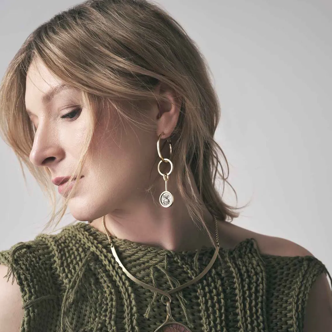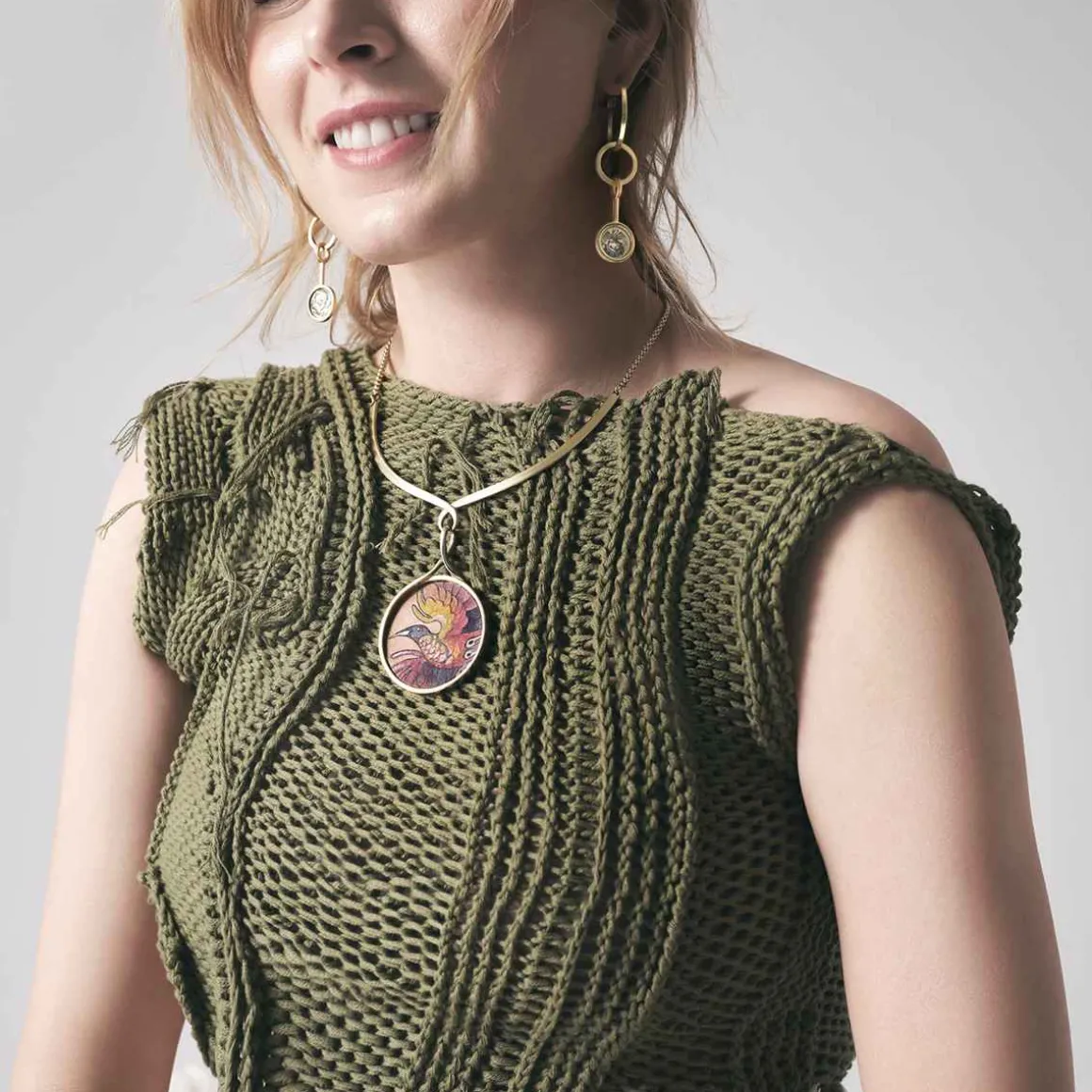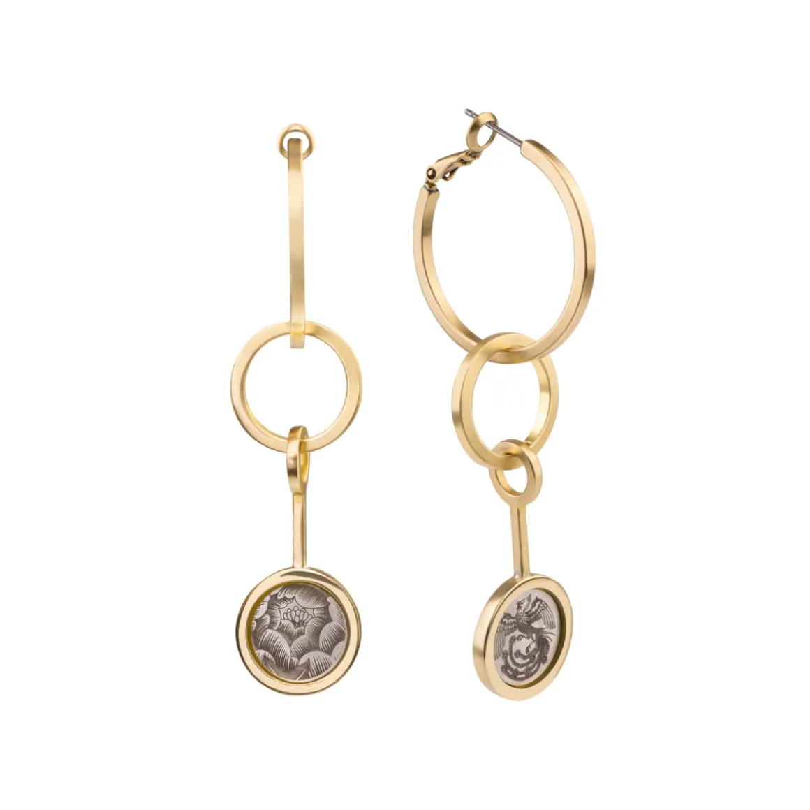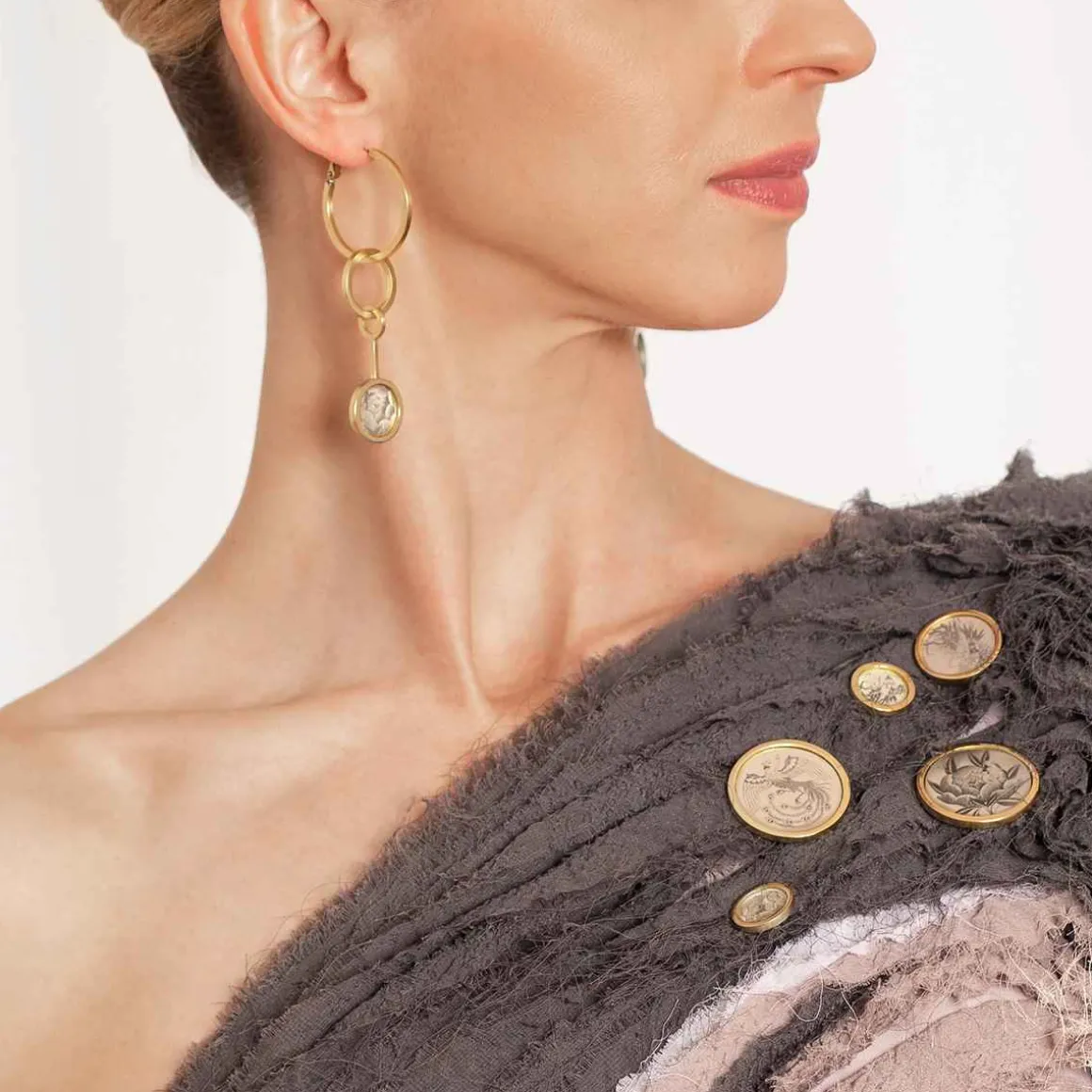 Asymetryczne kolczyki zostały wykonane ręcznie. Do pozłacanych kół podwieszono mniejsze koło z okrągłym, grawerowanym elementem. Jeden kolczyk ozdobiony jest motywem piwonii, która w tradycji japońskiej oznacza cesarza. Jest także symbolem zdrowia i powodzenia. Drugi ozdobiono motywem feniksa, który symbolizuje dobrobyt i pokój. Sztyfty i zapięcia kolczyków wykonano ze srebra.