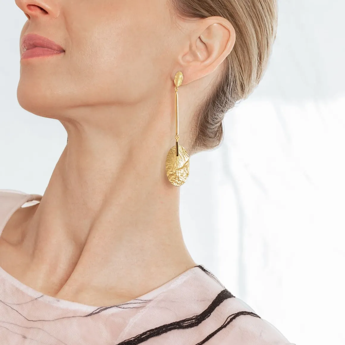 Artystyczne kolczyki na sztyfcie z kolekcji Moon zostały ręcznie wykonane z pozłacanego mosiądzu. Owalne płaszczyzny, pod wpływem wysokiej temperatury, przyjęły niepowtarzalną strukturę zagięć, która przywodzi na myśl krajobraz księżycowy. Powierzchnia wiszących kolczyków posiada satynowe wykończenie. Nowoczesnego sznytu dodają im proste, podłużne elementy wykończone na wysoki połysk. Oryginalny design najlepiej prezentuje się w towarzystwie innych wzorów z tej samej kolekcji. Pozostaje więc tylko wybrać wielkość konstelacji, aby stworzyć własny Układ Słoneczny.
