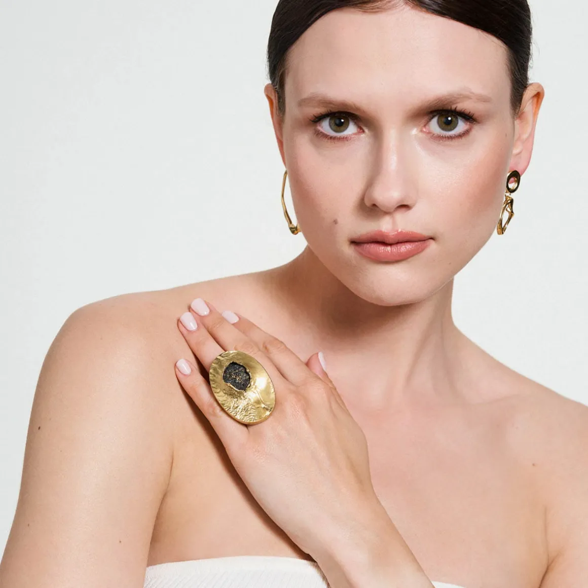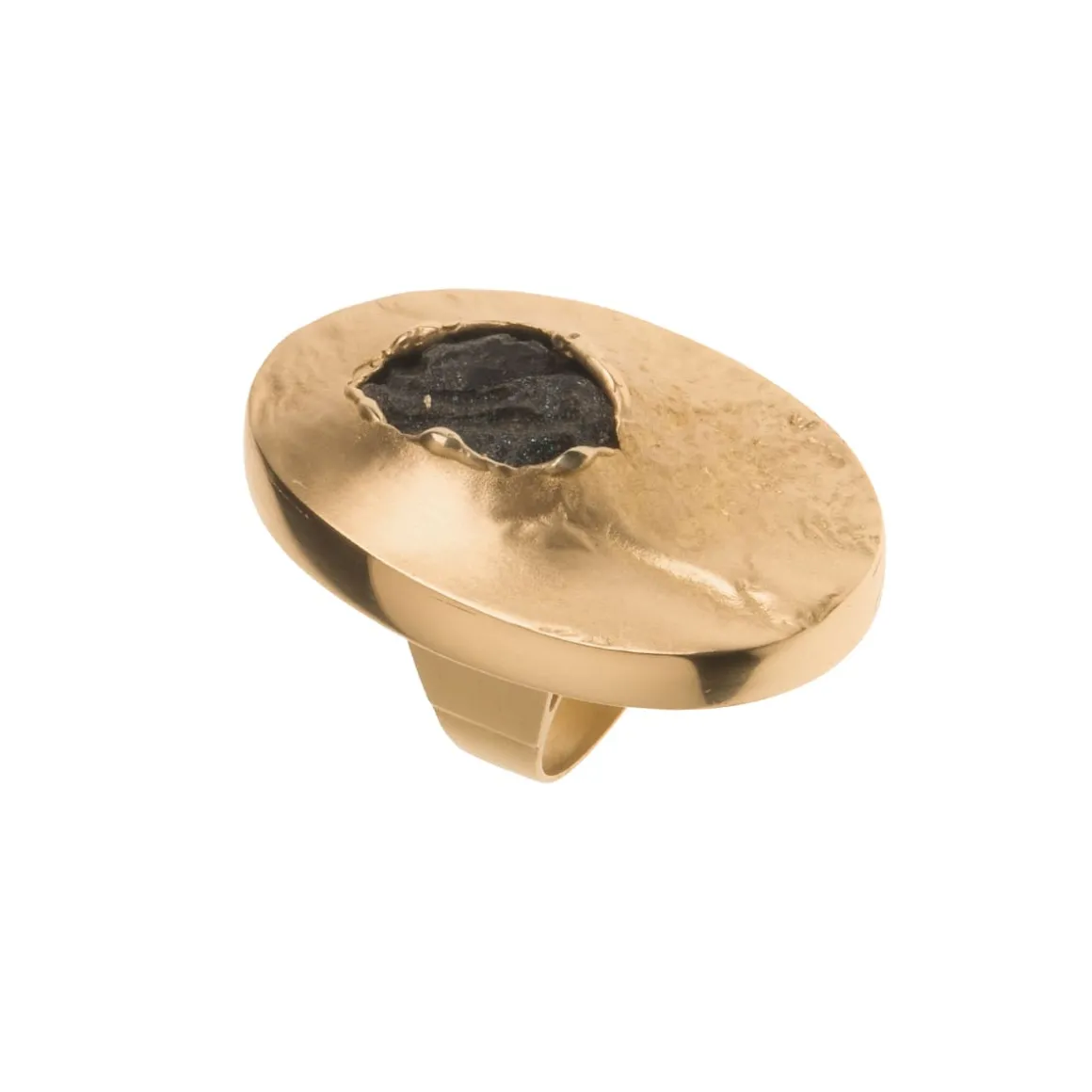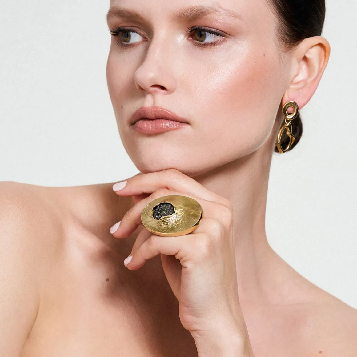 Niepokój o to, co pozostawimy po sobie przyszłym pokoleniom zainspirował ORSKA do opracowania koncepcji reinkarnacji poprzemysłowego plastiku, który został poddany eksperymentalnej obróbce. W efekcie tego procesu powstał syntetyczny kamień, który stanowi serce kolekcji New Stone. Lekka, czarna bryła o tęczowym połysku i fakturze przywodzącej na myśl krystalizację naturalnych minerałów została uformowana przez Weronikę Banaś z przetworzonego plastiku z dodatkiem opiłków mosiądzu z pracowni ORSKA. Okazały pierścionek został ręcznie wykonany z pozłacanego mosiądzu. Nieregularny kształt tworzy interesującą formę, która przyciąga uwagę. Surowa, nieidealna faktura mosiądzu przywodzi na myśl skojarzenia naturalnych, chropowatych powierzchni skalnych, co podkreśla niebanalny charakter całości.