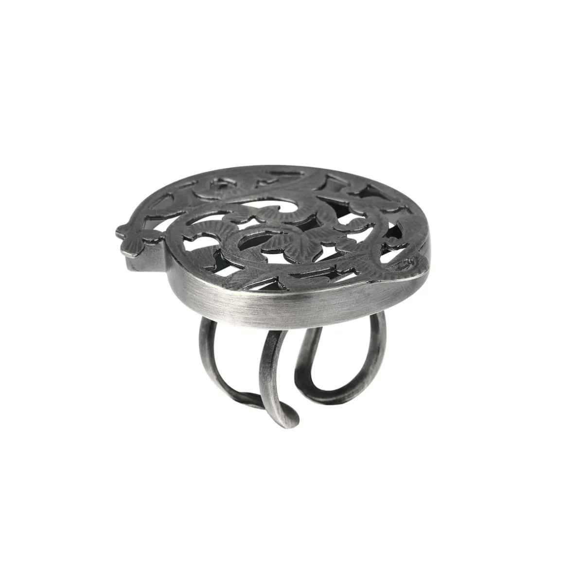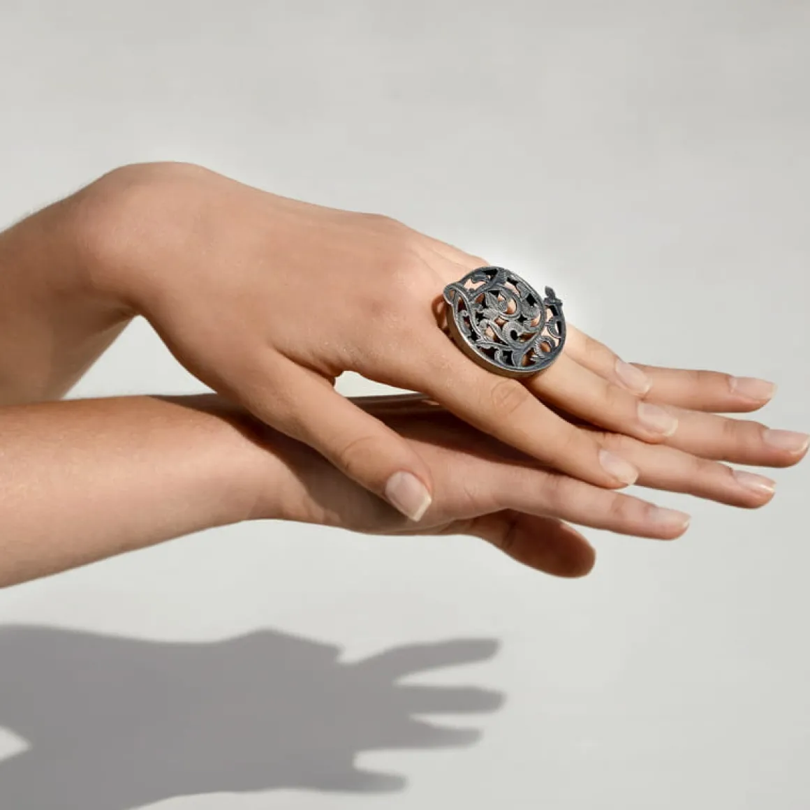 Pierścionek został wykonany ręcznie ze srebra w marokańskim warsztacie. Mistrzowie z Marrakeszu wycięli okrągły kształt i nadali mu ażurową strukturę o floralnym wzorze. Chcąc podkreślić grę światłocienia, w warsztacie ORSKA pierścionek dodatkowo został oksydowany, co nadało mu głęboki, grafitowy kolor. Całość osadzono na podwójnej, otwartej obrączce. Jeśli nie masz pewności, jaki rozmiar pierścionka wybrać, na naszej stronie internetowej w zakładce “rozmiary” znajdziesz dokładne wskazówki.