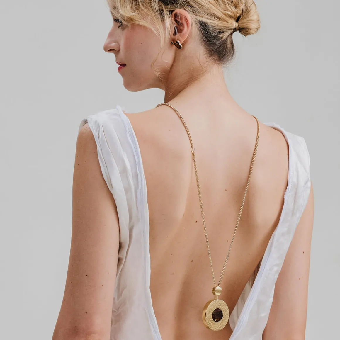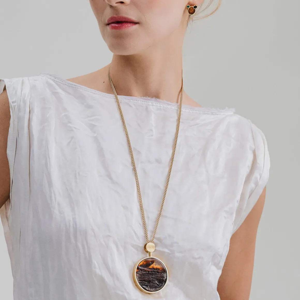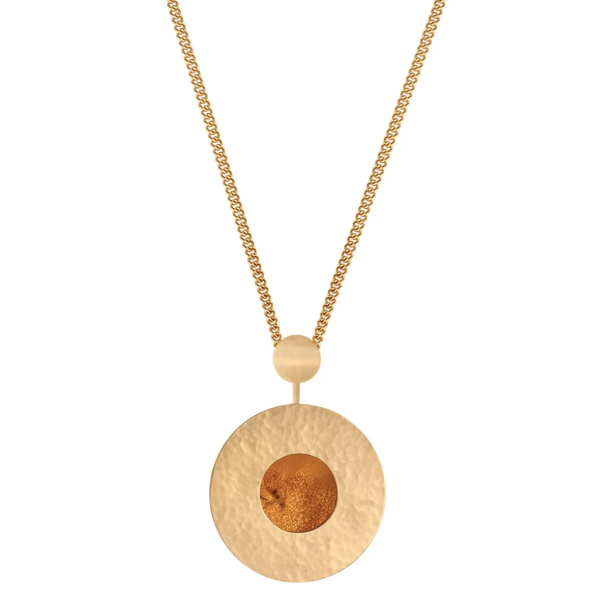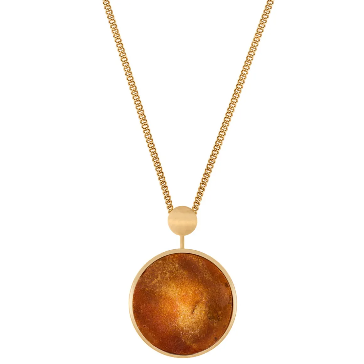 Naszyjnik składa się z eleganckiego łańcuszka o splocie kostki, okrągłego wisiora z bursztynem w złotej oprawie oraz zapięcia na karabińczyk z logo ORSKA. Naszyjnik daje możliwość regulacji długości na trzech wysokościach. Bursztyny różnią się między sobą kolorem oraz inkluzjami, dzięki czemu każdy naszyjnik jest unikatem. Naszyjnik jest w 100% wykonany ręcznie.