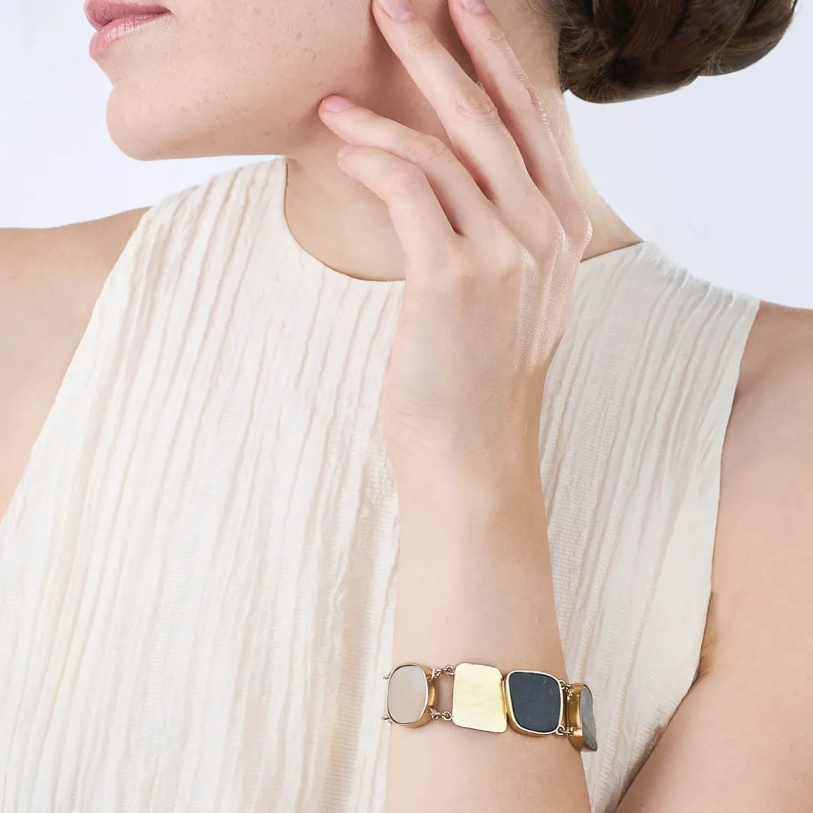 Artystyczna bransoletka z kolekcji Monumental została wykonana ręcznie w pracowni ORSKA. Powstała poprzez zestawienie ze sobą kilku wielobarwnych ceramicznych elementów oraz mosiężnych, pozłacanych form o kutej powierzchni. Fragmenty wykorzystanej ceramiki inspirowane są wzorami narysowanymi na skałach przez naturę, ich indywidualnym układem użyłkowania, kompozycjami barw i inkluzji. Dzięki temu każda bransoletka delikatnie różni się od przedstawionej na zdjęciach. Geometryczne formy podkreślają naturalne piękno flizy, a złote ogniwa nadają całości charakteru. Bransoletka zapinana jest na karabińczyk i zakończona logo ORSKA. Pozłacana bransoletka doskonale prezentuje się solo, ale lubi też towarzystwo pozostałych wzorów z kolekcji Monumental. Długi naszyjnik typu krawat lub ceramiczny pin utworzą wraz z nią duet, obok którego nie da się przejść obojętnie. Na naszej stronie internetowej w zakładce rozmiary znajdują się wskazówki jak odpowiednio dobrać rozmiar bransoletki.