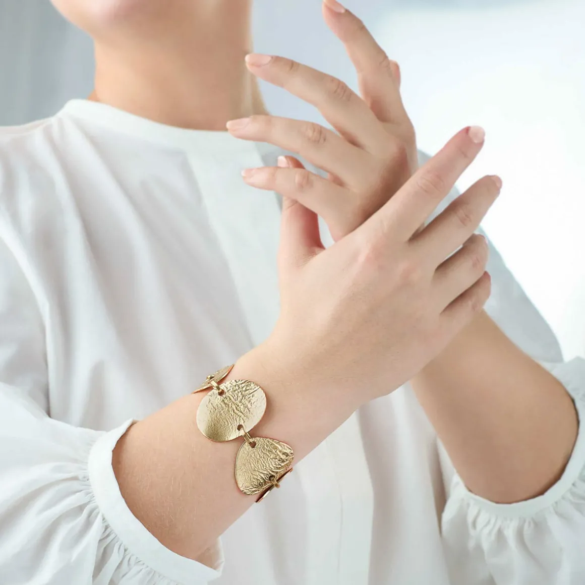 Artystyczna bransoletka z kolekcji Moon została ręcznie wykonana z pozłacanego mosiądzu. Owalne płaszczyzny, pod wpływem wysokiej temperatury, przyjęły niepowtarzalną strukturę zagięć, która przywodzi na myśl krajobraz księżycowy. Bransoletka składa się z kilku połączonych ze sobą, mosiężnych elementów o satynowym wykończeniu. Oryginalny design najlepiej prezentuje się w towarzystwie innych wzorów z tej samej kolekcji. Pozostaje więc tylko wybrać wielkość konstelacji, aby stworzyć własny Układ Słoneczny.