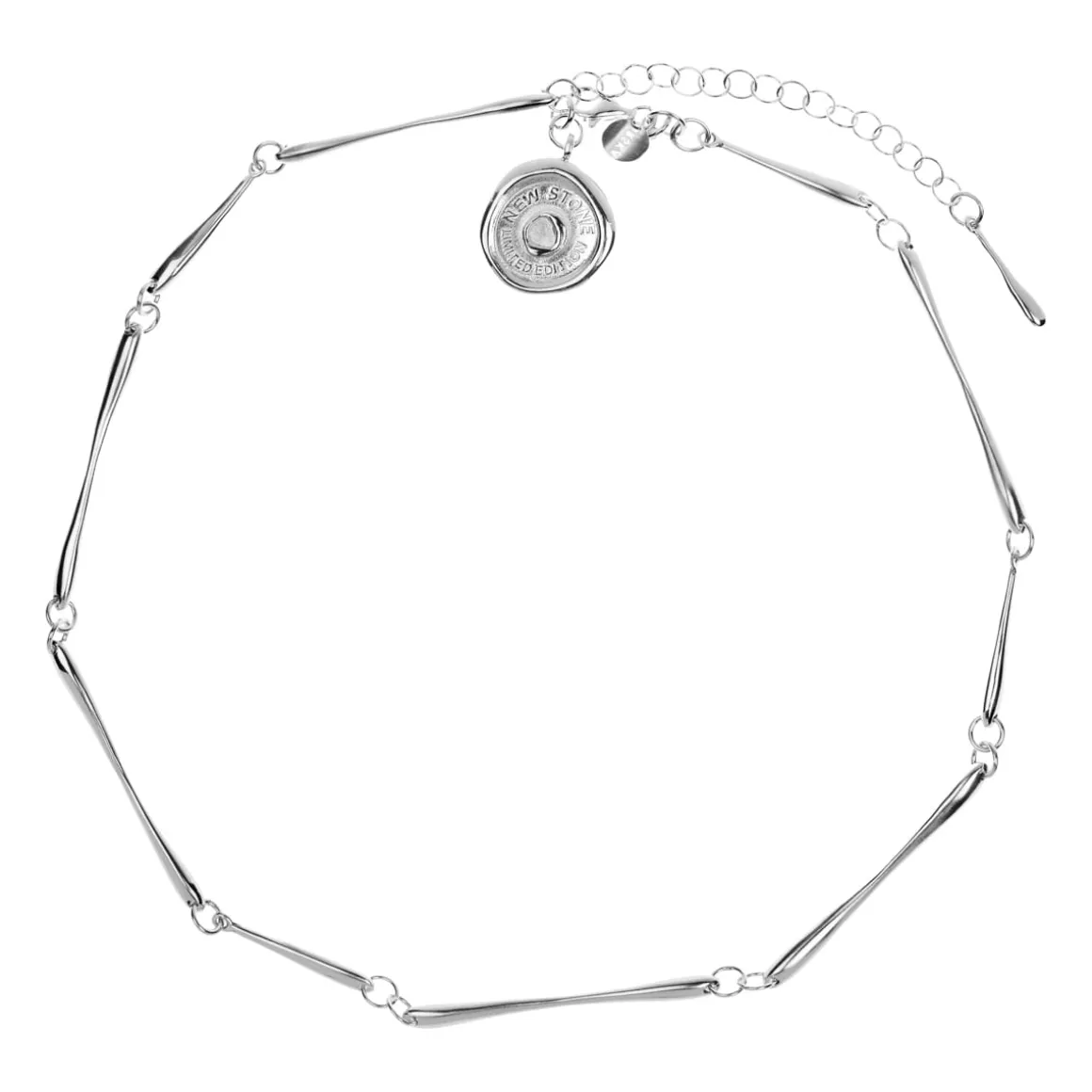 Delikatny naszyjnik został wykonany z połączonych ze sobą, podłużnych kropel. Poszczególne elementy są różnej długości, co podkreśla oryginalny charakter ręcznie wykonanej biżuterii. Dzięki przedłużce, zakończonej metalową kroplą, srebrny naszyjnik ma możliwość regulacji długości. Tuż przy zapięciu naszyjnik został opatrzony okrągłą nieregularna pieczęcią “made by Homo Sapiens”. Nawiązując do przesłania kolekcji przypomina ona o odpowiedzialności za dzieła, które tworzymy i ich wpływ na przyrodę. Opływowy, nieregularny kształt elementów tworzących naszyjnik, kojarzy się z wodą, która zbyt często staje się docelową destynacją dla jednorazowego plastiku.