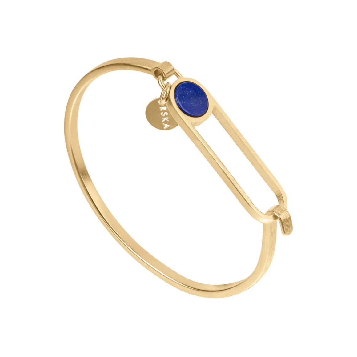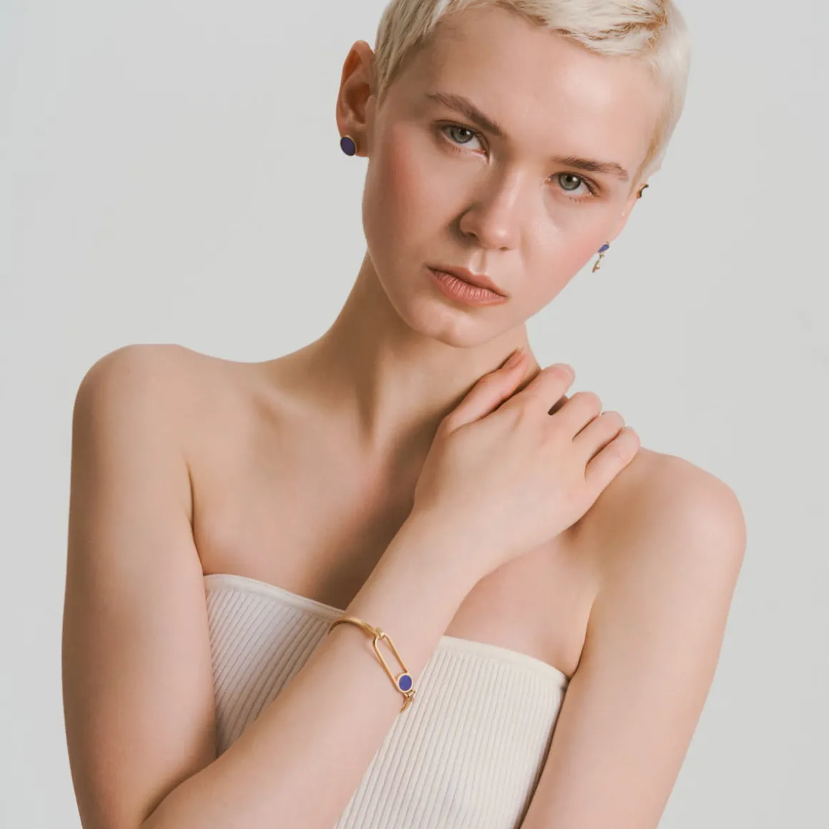 Bransoletka z kolekcji Orini została wykonana w naszym warsztacie z pozłacanego mosiądzu. Smukła, sztywna obręcz delikatnie oplata nadgarstek. Centralnym punktem biżuterii jest owalny element ozdobiony okrągłym kamieniem lapis lazuli, którego głęboki niebieski odcień kontrastuje ze złotym kolorem oprawy. Bransoletka ma ręcznie szczotkowaną obręcz, natomiast geometryczna forma ma gładkie, satynowe wykończenie. Ta gra struktur symbolizuje dualizm światła i cienia, przypominając, że jedno i drugie są nieodłącznym elementem cykliczności życia.