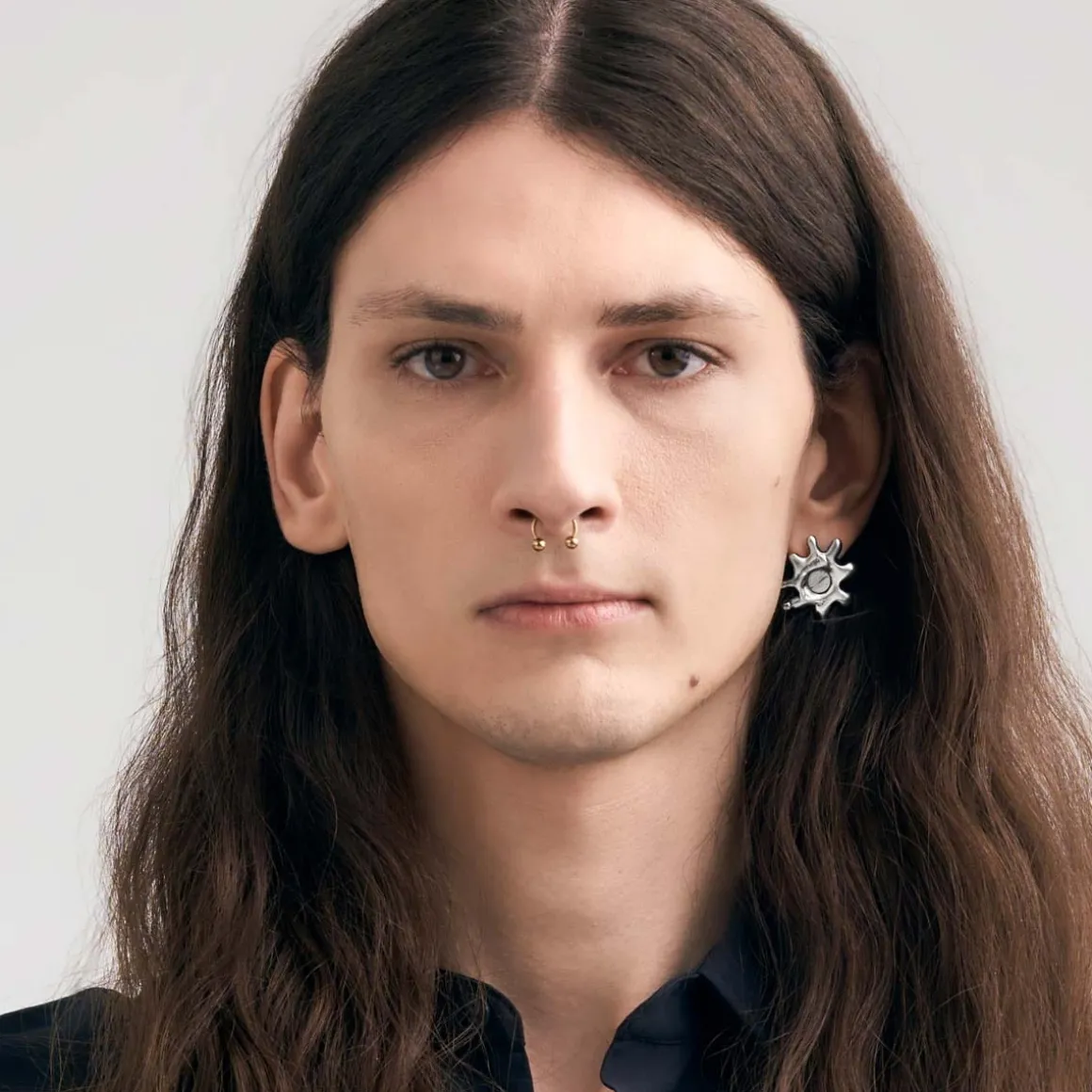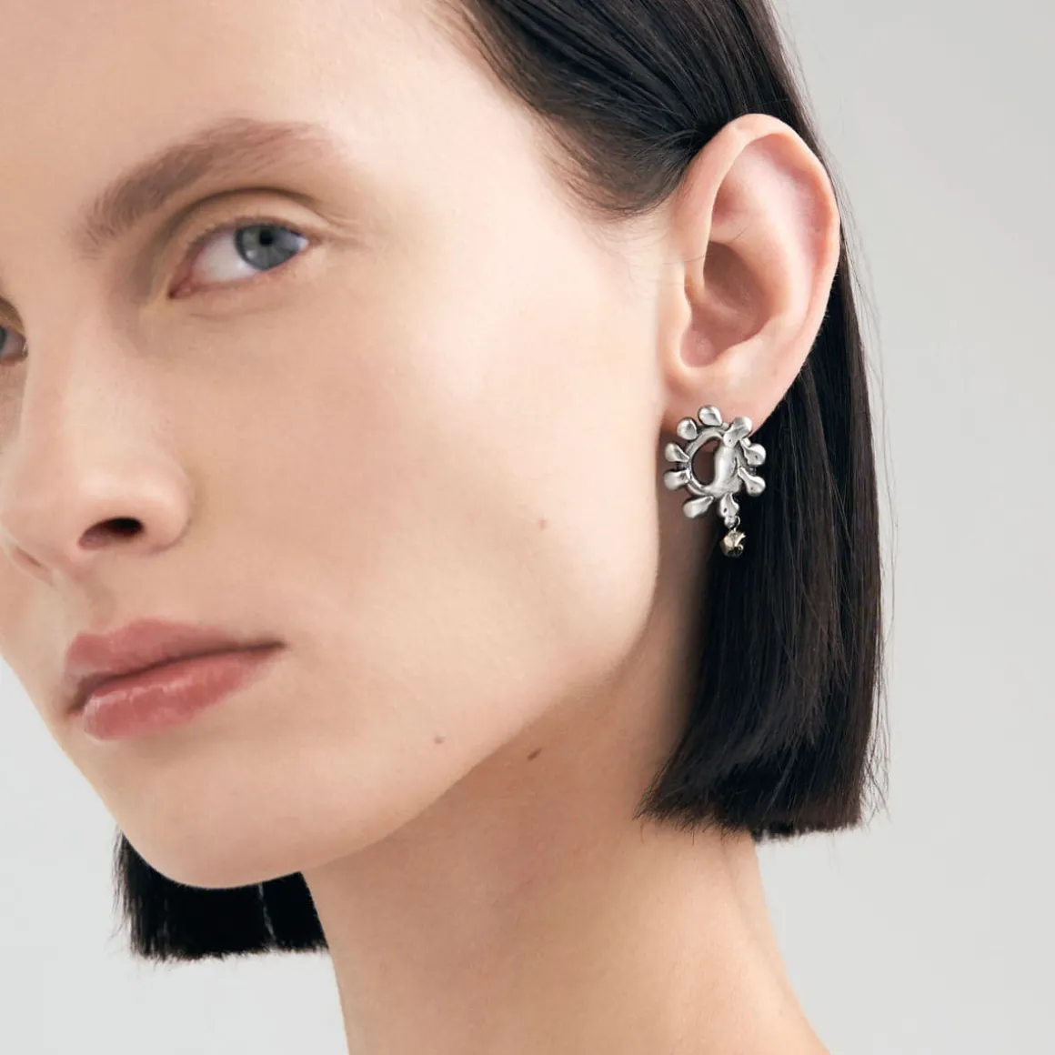 Kolczyki na sztyft z kolekcji Meteoros to połączenie najstarszego na naszej Planecie surowca i artystycznego kunsztu jubilerów ORSKA, które razem tworzą kompozycję inspirowaną niezmierzoną przestrzenią kosmosu. Kolczyki zostały wykonane ręcznie ze srebra próby 925. Dzięki metodzie lanego metalu kolczyki zyskały miękną, niemal płynną formę, która od razu przyciąga wzrok. Jeden z kolczyków ma kształt nieregularnej, rozgałęzionej formy, przypominającej eksplozję gwiezdnej materii, w którego centrum osadzono fragment meteorytu Aletai. Kamień jest okrągły, o naturalnej srebrzystej powierzchni i jodełkowej strukturze. Ujawniająca się po szlifowaniu meteorytu kompozycja zwana jest wzorem Widmanstaetena. Szaro-stalowa barwa meteorytu przenika się z błyszczącym srebrem otaczającej go oprawy. Drugi, asymetryczny kolczyk posiada nieregularną formę z wydłużonymi, zaokrąglonymi wypustkami i dodatkowo ozdobiony jest wiszącym, fasetowanym pirytem.