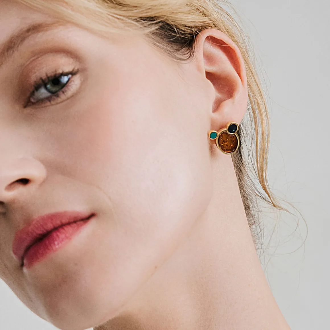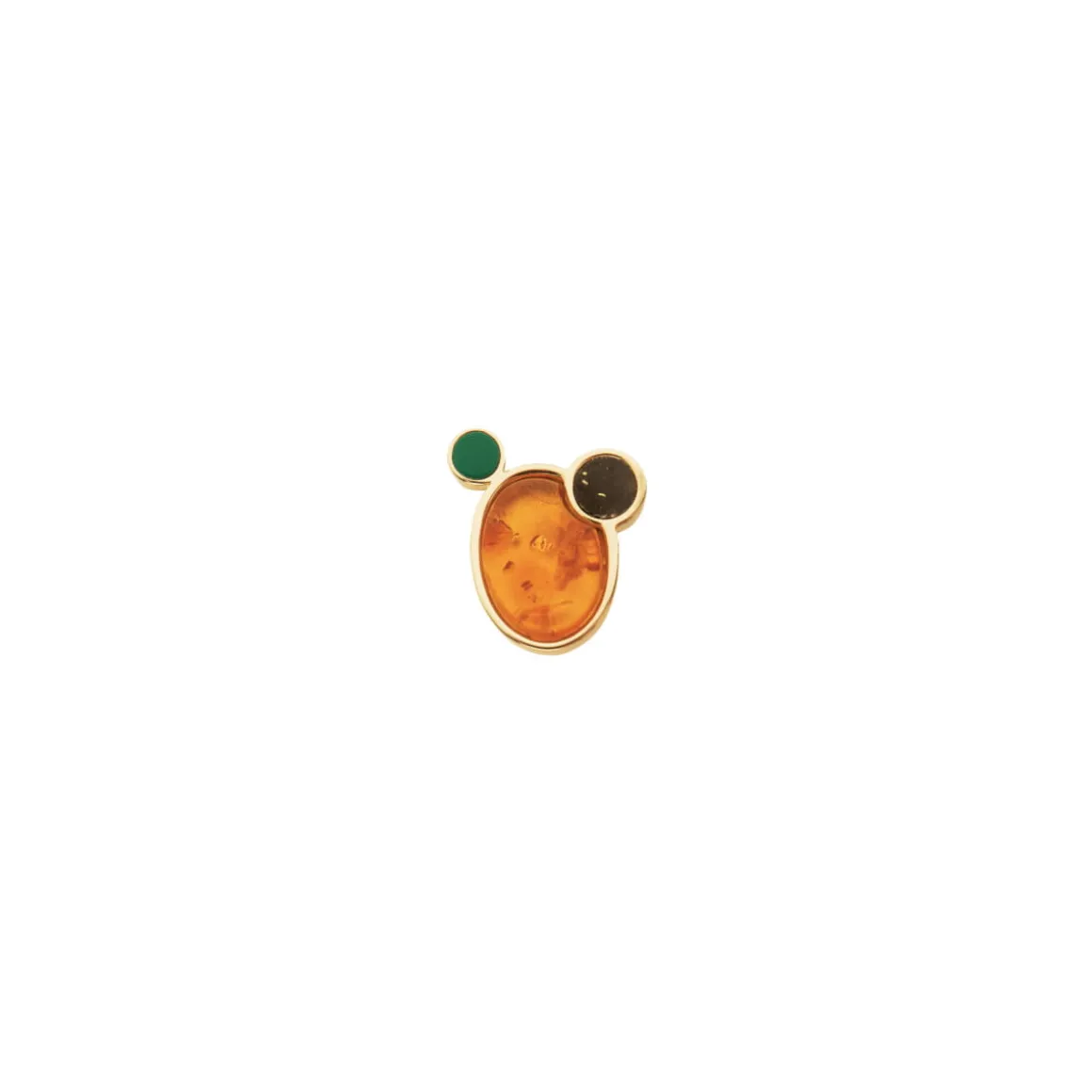 Dwa okrągłe kamienie Mare: jeden w czarnym, drugi w zielonym kolorze, artystka zestawiła z owalnym bursztynem w koniakowym kolorze, który oszlifowano w rodzinnej pracowni na Mierzei Wiślanej. Syntetyczny i naturalny kamień w pracowni ORSKA zostały ujęte w satynową oprawę z pozłacanego mosiądzu. Artystyczna biżuteria z nowoczesnymi akcentami stworzy idealny duet z pozostałymi wzorami z kolekcji Baltica. Kolczyk, chodź sprzedawany pojedynczo, świetnie odnajdzie się w duecie.