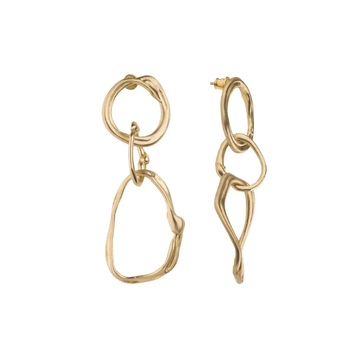 Kolczyki zostały wykonane ręcznie w pracowni ORSKA z pozłacanego mosiądzu. Każdy kolczyk z pary jest połączeniem trzech ogniw o falowanej linii. Charakterystycznych dla kolekcji New Stone nieregularnych kształtów nie mogło zabraknąć również w tej parze kolczyków. Surowe, asymetryczne okręgi tworzą interesującą formę, która przyciąga uwagę. A ich kształt budzi skojarzenia z wodą mórz i oceanów, która często staje się ostatnim przystankiem na drodze jednorazowego plastiku.