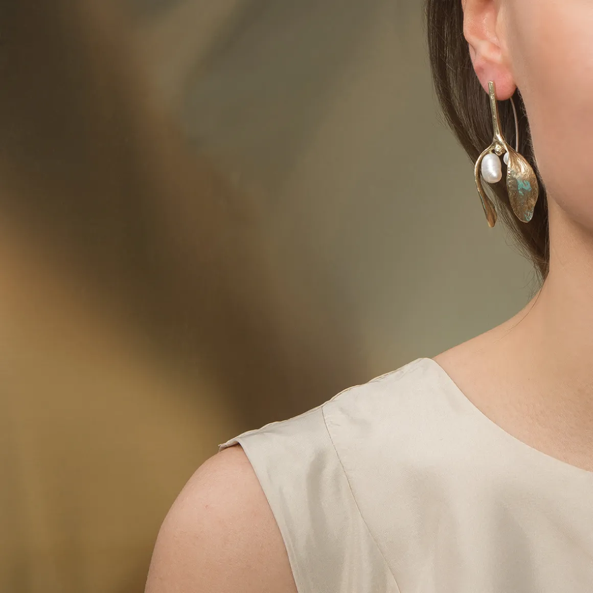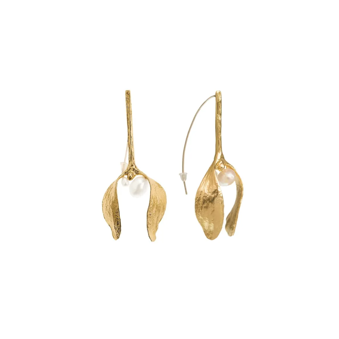Te ręcznie wykonane kolczyki są inspirowane jemiołą. Roślina ta od czasów starożytnych była uważana za dar od bogów oraz panaceum na wszelkie dolegliwości. Witalność jemioły jest tak silna, że nawet na bezlistnym drzewie pozostaje ona wiecznie zielona. Warto więc korzystać z jej magicznej mocy, ponieważ noszona przy ciele przynosi pomyślność, chroni przed złem i — co najważniejsze — wzmacnia więź między duszą a ciałem. Roślina została odwzorowana w swojej naturalnej formie i rzeczywistym rozmiarze. Kolczyki zostały ozdobione hodowlanymi perłami.