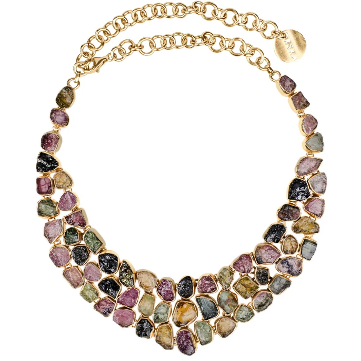 Okazała kolia została stworzona z wielobarwnych turmalinów ułożonych w świetliste pasy, przypominające zorze polarne rozpięte na nocnym niebie. Kamienie użyte w tej wyjątkowej mozaice pochodzą z Radżastanu, gdzie zostały obrobione w niewielkim, rodzinnym warsztacie jubilerskim. Anna Orska poznała jego właścicieli podczas jednej ze swoich projektowych podróży do Indii. Turmaliny nie były szlifowane, lecz łupane – dzięki temu zachowały pierwotny charakter, surową fakturę i nieregularne formy. Każdy z nich został indywidualnie oprawiony w pozłacane srebro, co podkreśla ich asymetryczne kształty i naturalne piękno. To podejście wyróżnia kolekcję, gdyż w jubilerstwie zwykle stosuje się powtarzalne, ustandaryzowane oprawy. Kolia zakończona jest regulowaną przedłużką z zawieszką w formie logo ORSKA, która pozwala dopasować jej długość.