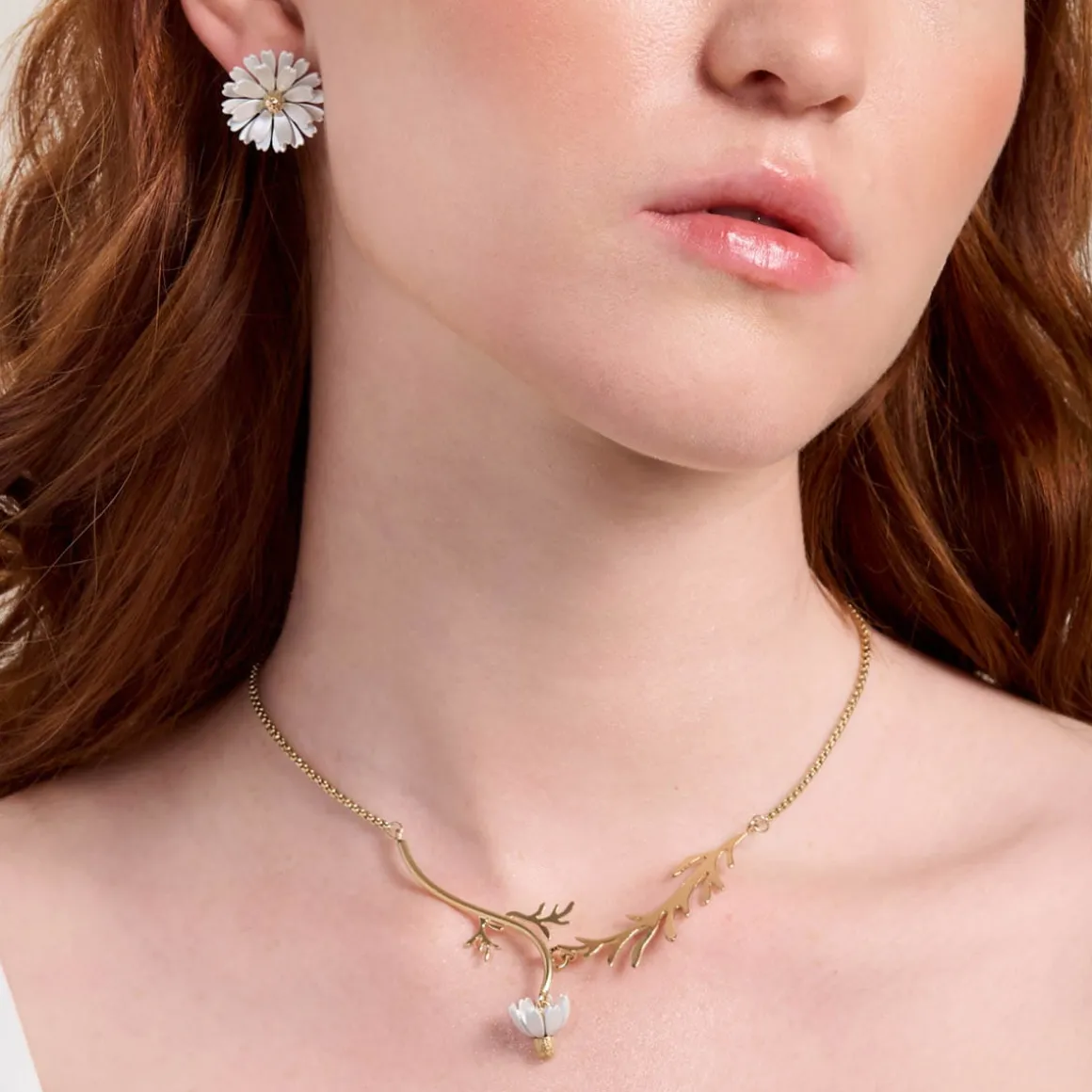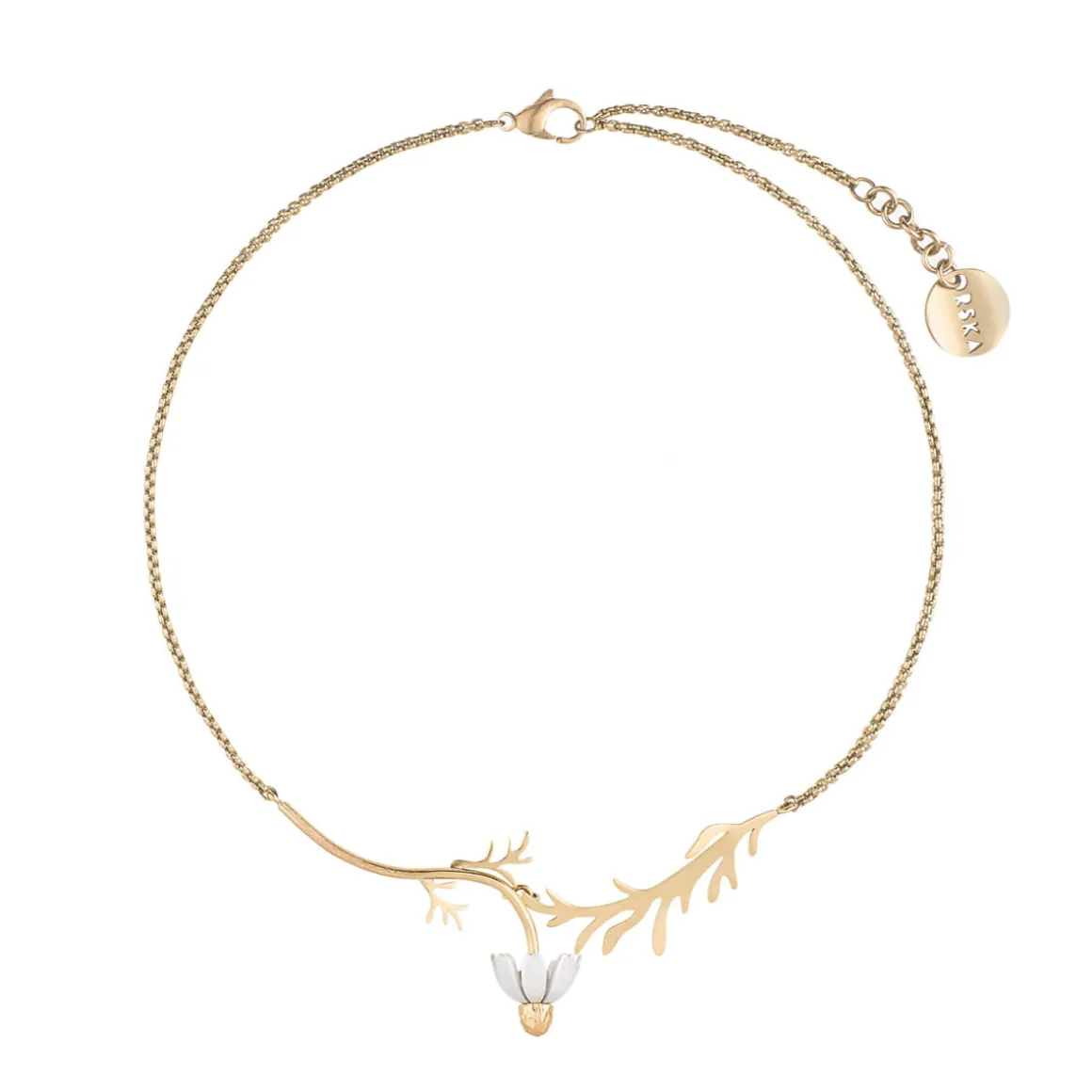 Ręcznie wykonany naszyjnik składa się ze złoconego mosiądzu i malowanych, białych płatków kwiatu w postaci zawieszki. Łańcuszek o splocie kostki zdobią złocone, liściaste gałązki, z których miękko spływa kwiat rumianku. Całość wykończono zawieszką z logo ORSKA, kilkucentymetrową przedłużką (która pozwala dostosować długość naszyjnika do własnych preferencji) oraz wygodnym zapięciem na karabińczyk. Naszyjnik z rumiankiem doda lekkości wieczornym stylizacjom, a te codzienne zyskają dzięki niemu odrobinę blasku i fantazji. Rumianek poza swoim niewątpliwym urokiem, jest też słowiańskim symbolem głębokiej więzi i miłości. Dlatego biżuteria z tym motywem będzie pełnym znaczenia uzupełnieniem ślubnych kreacji oraz symbolicznym podarunkiem dla ukochanych.