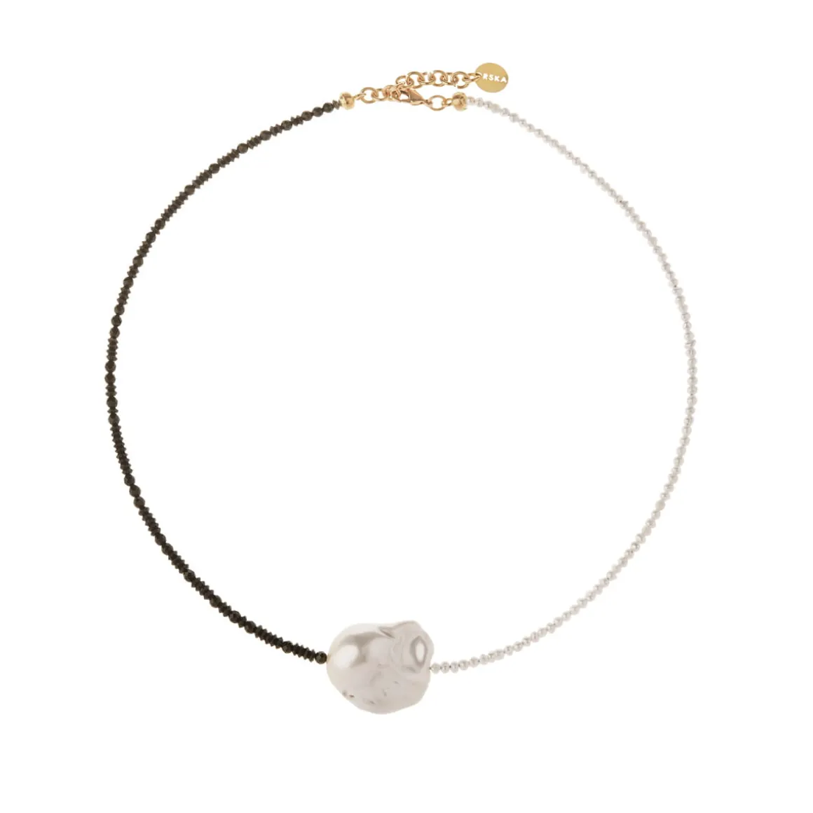 Krótki naszyjnik powstał z wykorzystaniem perły i onyksów, których głęboka czerń subtelnie kontrastuje z satynową powierzchnią słodkowodnych klejnotów. Elegancki naszyjnik ozdobiony został okazałą, nieregularną perłą z zatoki Ha long i wykończony mosiężnym łańcuszkiem, który umożliwia niewielką regulację długości. Charakterystyczne wzornictwo i wyrazista kolorystyka ukazują współczesną interpretację sztuki według artystki. Artystyczna biżuteria w połączeniu z kolczykami stworzy niebanalny komplet.