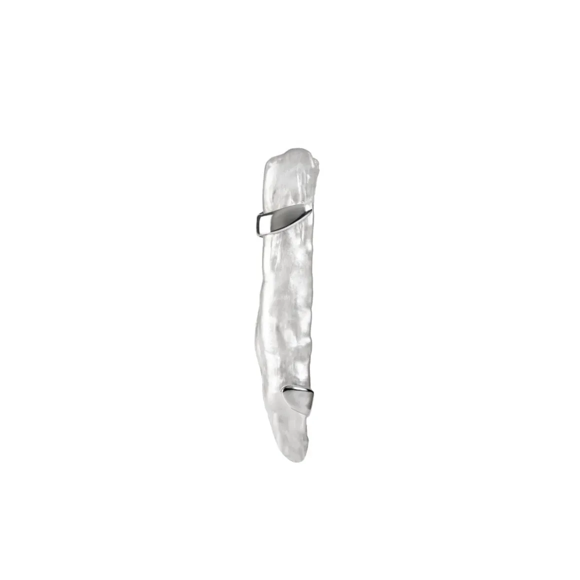 Sercem tego pinu jest perła – okazała, efektowna, nieoczywista. Nie ma dwóch takich samych pereł, każdy pin jest inny. Anna Orska kolekcjonowała te okazy przez kilka lat, dbając o ich ciekawe, nieregularne kształty. Dzięki temu każdy egzemplarz jest małym dziełem sztuki, rzeźbą stworzoną przez naturę. Podłużna perła została uchwycona w delikatne srebrne ramy, które subtelnie otulają kamień, podkreślając jego kształt. Każdy egzemplarz oprawiany był indywidualnie, dlatego cienkie srebrne fragmenty mogą wyłaniać się z różnych stron pina w zależności od naturalnych wżłobień w perle. Jubilerzy z pracowni ORSKA z dużą zręcznością oprawili każdą perłę, podkreślając jej atuty i indywidualizm. Powierzchnia pereł pokryta jest charakterystycznymi wypukłościami i załamaniami, które sprawiają, że kamienie mienią się przy każdym ruchu.
