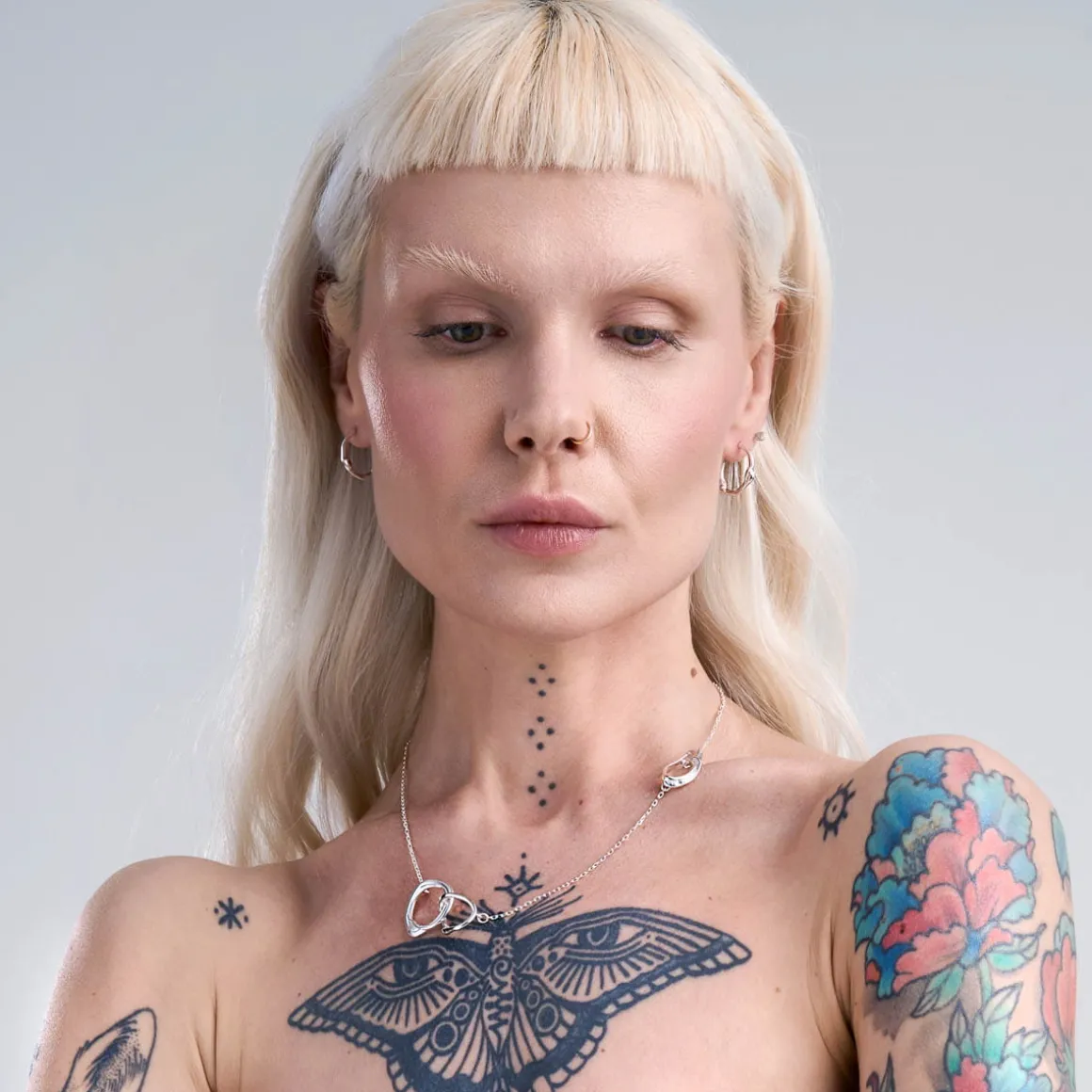 Krótki naszyjnik wykonano ręcznie ze srebra. Biżuteria łączy delikatny łańcuszek z asymetrycznymi zawieszkami w postaci okręgów. Trzy nieregularne ogniwa różnią się od siebie wielkością i kształtem. Pofalowana struktura sprawia, że wyglądają jakby były wykonane z lejącego się srebra. Wypolerowane na wysoki połysk jasne zawieszki nawiązują do tafli wody, w której jednorazowy plastik często kończy swój żywot. Ręcznie wykonany ze srebra naszyjnik, ma możliwość regulacji długości – krótką przedłużkę na końcu ozdobiono okrągłym logiem ORSKA.