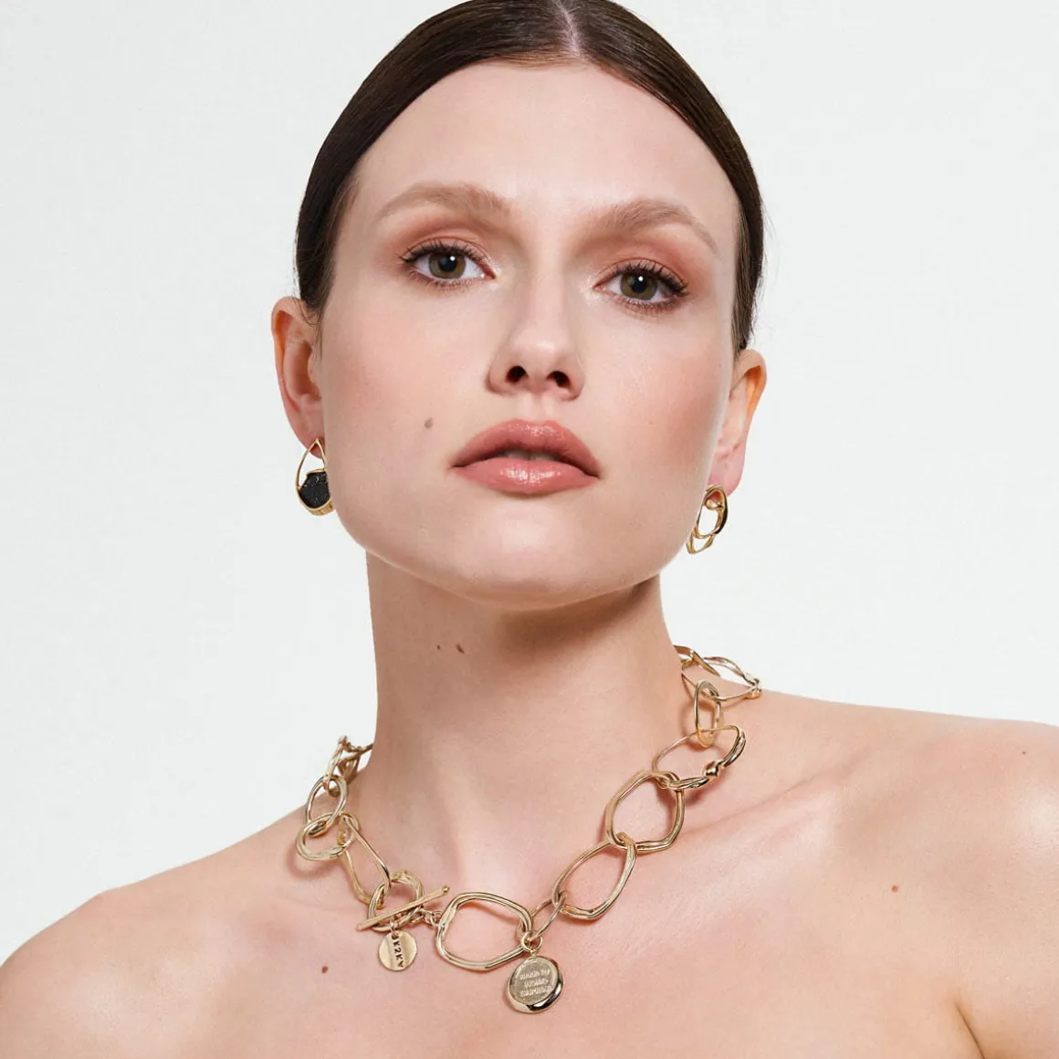 Krótki naszyjnik z kolekcji New Stone został wykonany ręcznie z pozłacanego mosiądzu. Połączone ze sobą ogniwa o nieregularnej linii i falistej strukturze tworzą efektowną kolię. Całość opatrzona została pieczęcią „made by Homo Sapiens”, która nawiązuje do myśli przewodniej kolekcji.
