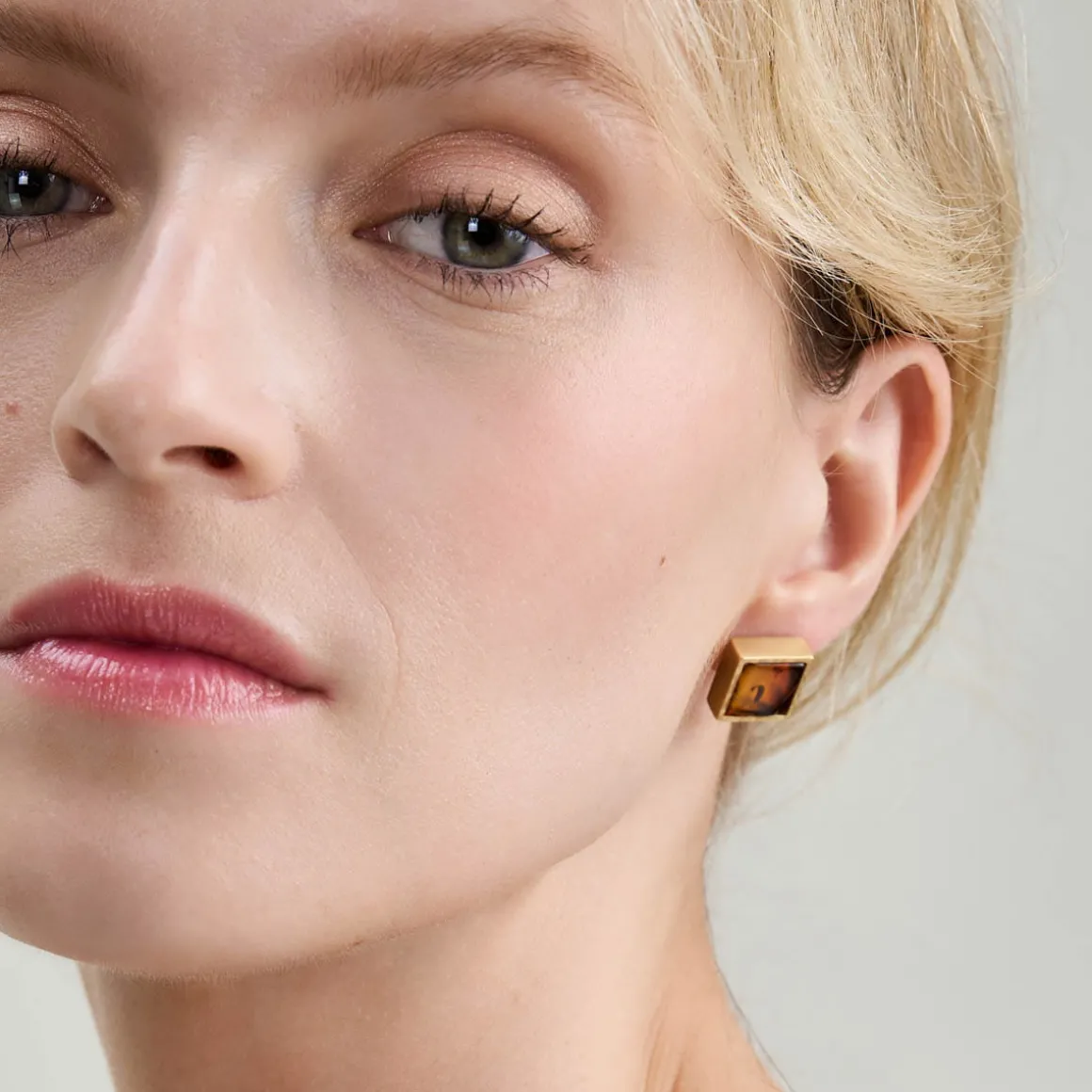 Kolczyki z kolekcji Baltica zostały wykonane ręcznie w pracowni ORSKA z pozłacanego mosiądzu i naturalnych bursztynów. Kwadratowy złoty kamień i kuta powierzchnia wokół bursztynu nadały kolczykom eleganckiego charakteru. Kolczyki są zapinane na sztyft z pozłoconego srebra, co zapewnia wygodę noszenia. W jednym z kolczyków spod przejrzystego bursztynu przeziera grawerunek owada, który przypomina, że bursztyn przez miliony lat zbierał ślady ówczesnego życia, dzięki czemu w zastygłej żywicy możemy obserwować ślady przeszłości. Drugi kolczyk, pozostając bez dodatkowych ozdób, zachował minimalistyczny wygląd.