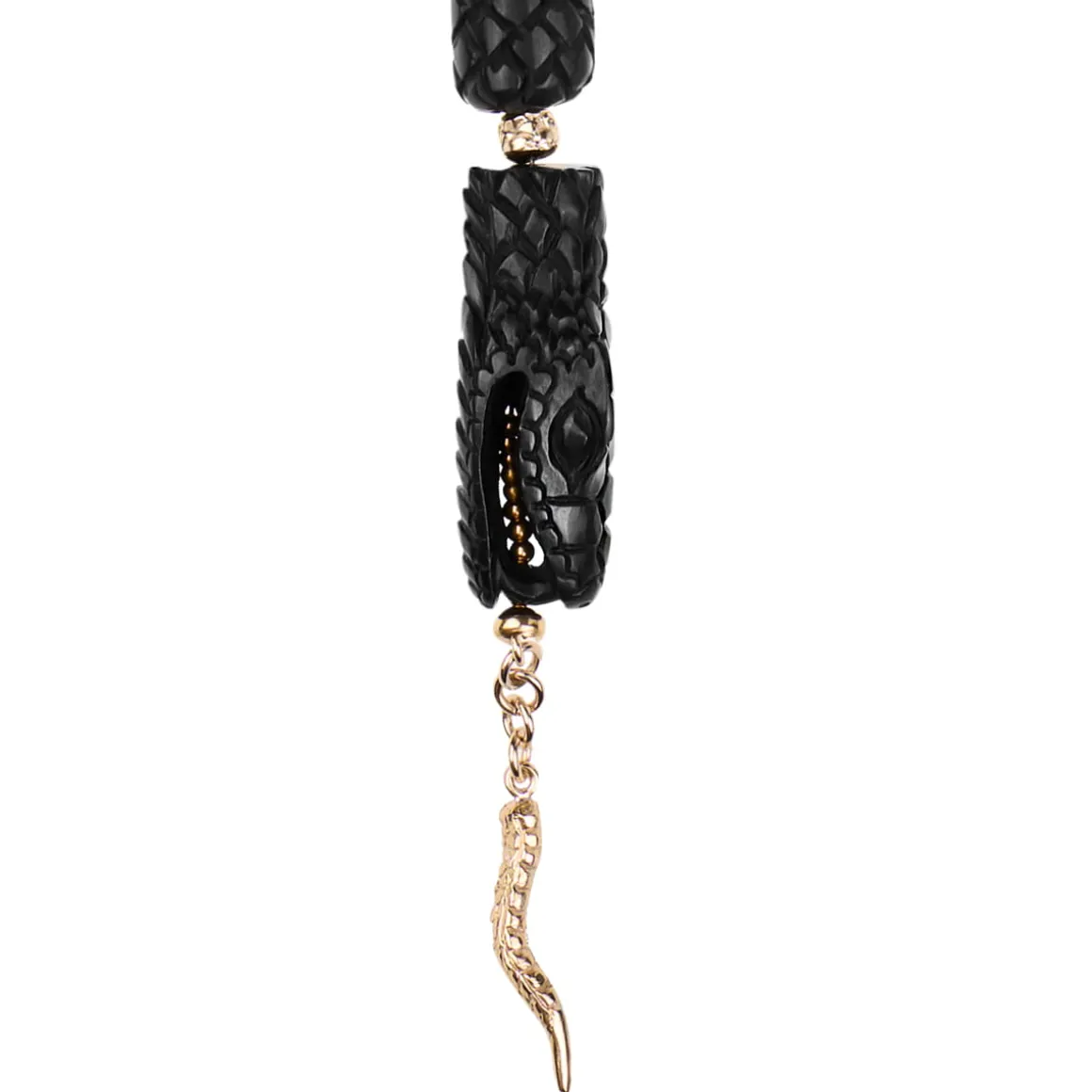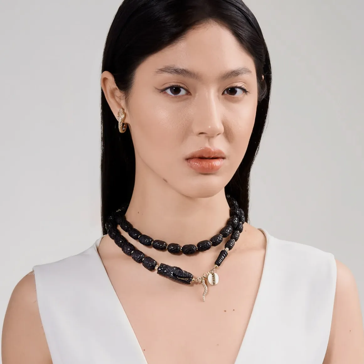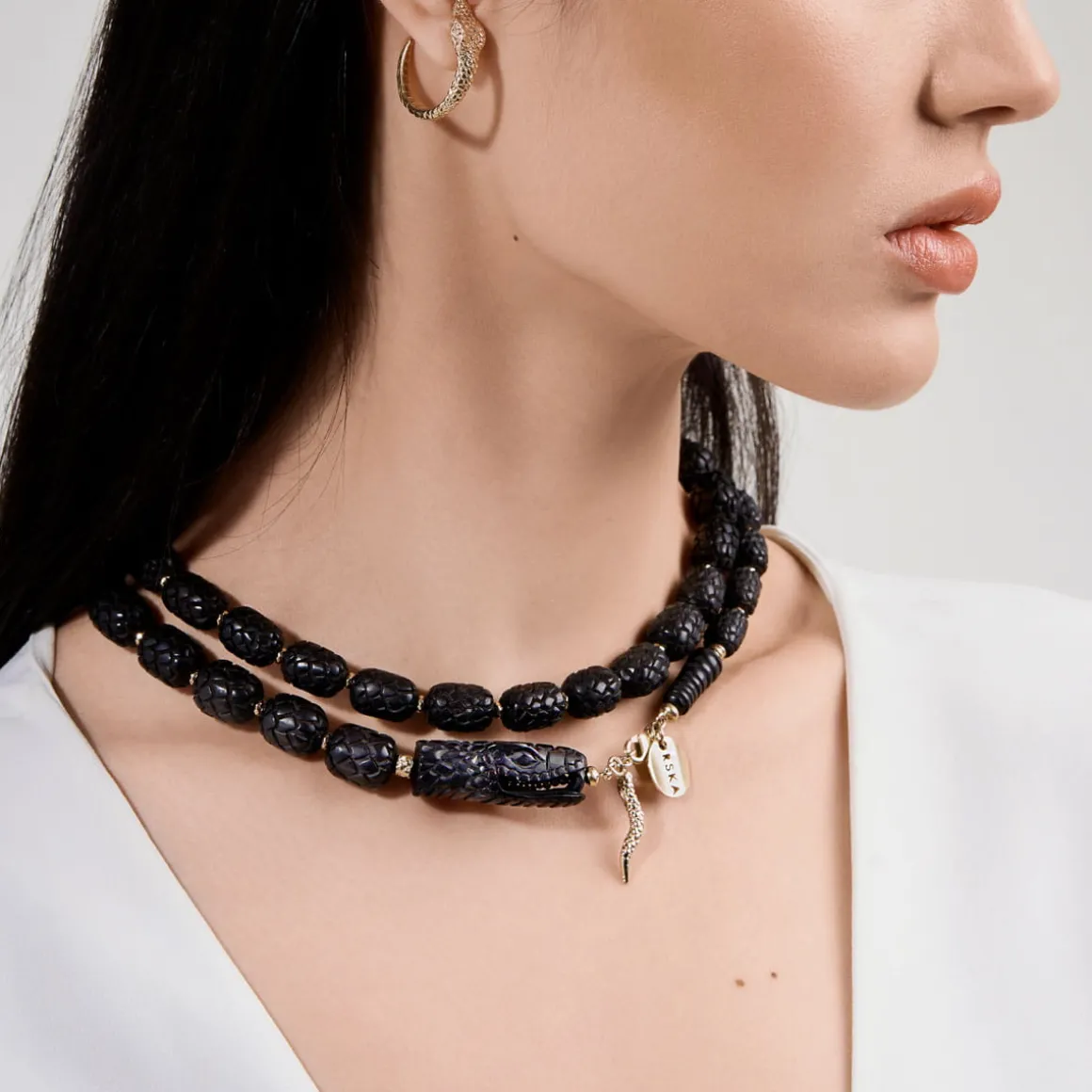 Naszyjnik w kształcie węża rzeźbiony był przez balijskich mistrzów przez kilkanaście godzin w drewnie różanym. Wprost z Bali misternie rzeźbione elementy w ciemnym kolorze trafiły do pracowni ORSKA. Jubilerzy złożyli je w sznur i przepletli każdy fragment galwanizowanym hematytem. Cała kompozycja została wykończona elementami z pozłacanego mosiądzu: wygodnym karabińczykiem, blaszką z wygrawerowanym napisem „Limited Edition” oraz logo ORSKA. Na szczególną uwagę zasługuje głowa węża z precyzyjnie wykonanymi drobnymi elementami: oczami oraz paszczą, w której widać pozłacany język przechodzący w zawieszkę naszyjnika.