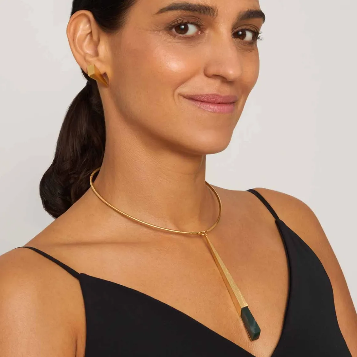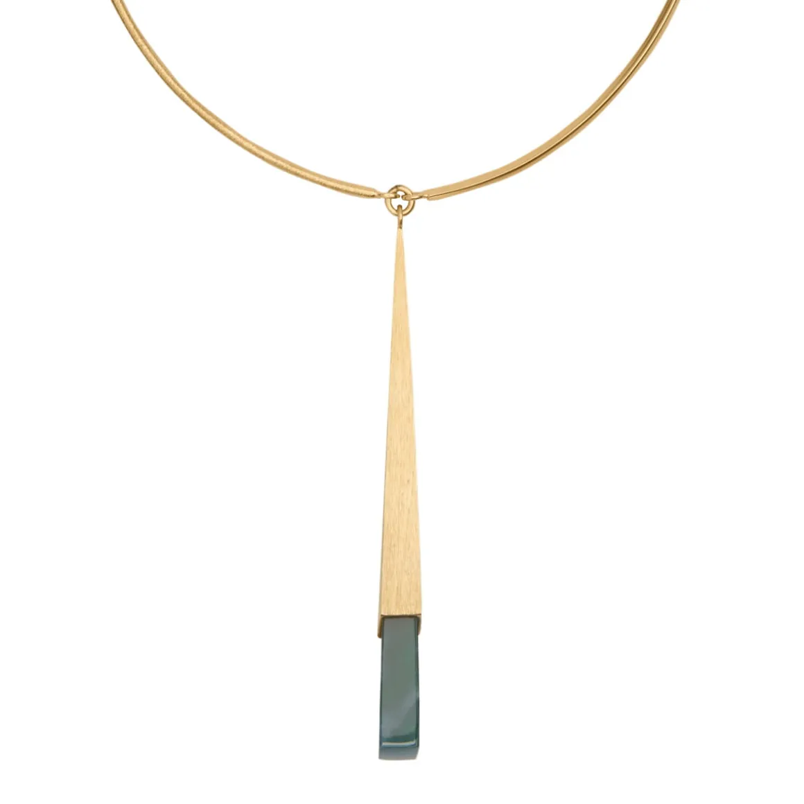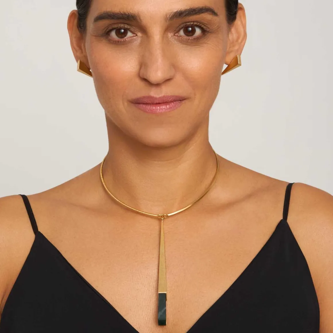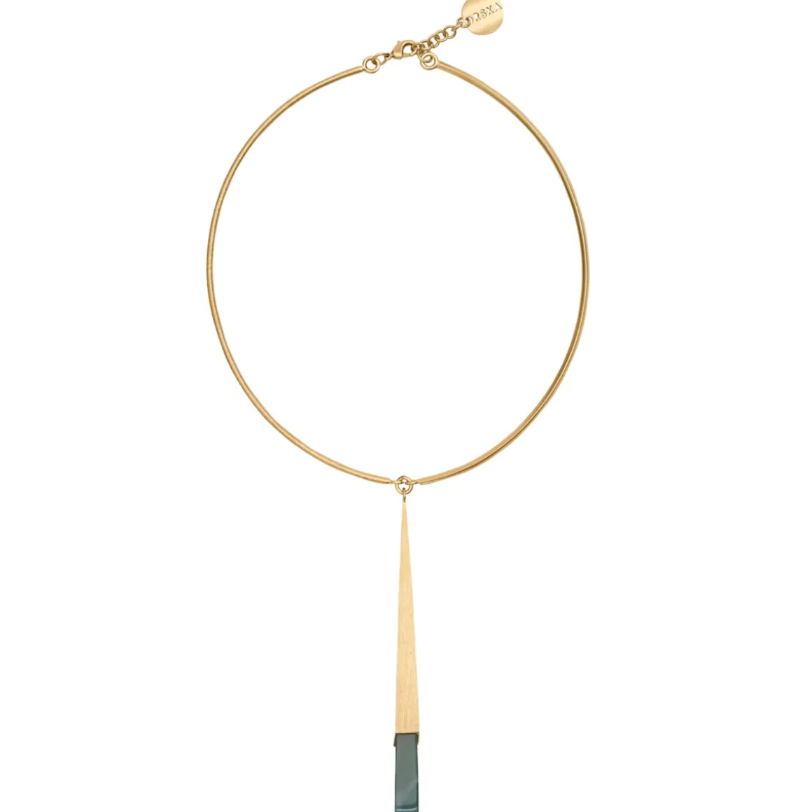 Kolia została wykonana ręcznie z pozłacanego mosiądzu. Sztywna obręcz subtelnie oplatająca szyję została opatrzona efektowną, geometryczną zawieszką. Wszystkie metalowe elementy mają charakterystyczne szczotkowane wykończenie – drapaną oryginalną fakturę, która przyciąga wzrok i nadaje kolii surowy charakter. Zawieszka w kształcie ostrosłupa została wykonana z bryłki precyzyjnie oszlifowanego zielonego jadeitu, który otula mosiężna, pozłacana oprawa. Jadeit został wypolerowany na wysoki połysk, co kontrastuje ze szczotkowanym wykończeniem metalowych elementów – to zderzenie blasku kamienia z szorstkością metalu tworzy oryginalną, pełną głębi kompozycję. Kolia zakończona jest przedłużką, która umożliwia regulację długości naszyjnika, do przedłużki przytwierdzono dodatkowo logo ORSKA.