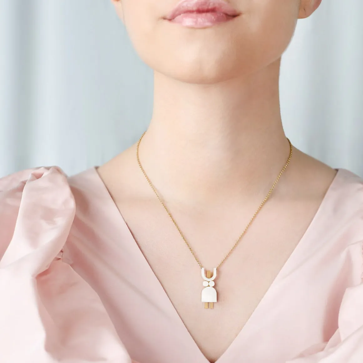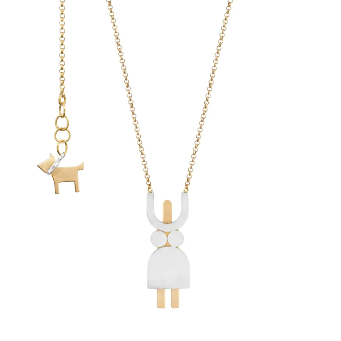 Robotyczna miłośniczka psów została wykonana ręcznie przez jubilerów ORSKA. Powstała z geometrycznych elementów w złotym i srebrnym kolorze. Zawieszkę złożono z pociągłej głowy, srebrnej sukienki, prostych nóg i ramion w kształcie łuku. Druga zawieszka w kształcie geometrycznego psa znajduje przy zapięciu naszyjnika i jest jednocześnie subtelną ozdobą karku. Zawieszkę w kształcie kobiety umieszczono na delikatnym, pozłacanym łańcuszku. Naszyjnik posiada również kilkucentymetrową przedłużkę oraz okrągłe logo ORSKA i zapięcie na karabińczyk. Oryginalny design przyciąga uwagę i wywołuje szeroki uśmiech na twarzy obserwującego, przywołując pozytywne, bajkowe skojarzenia.