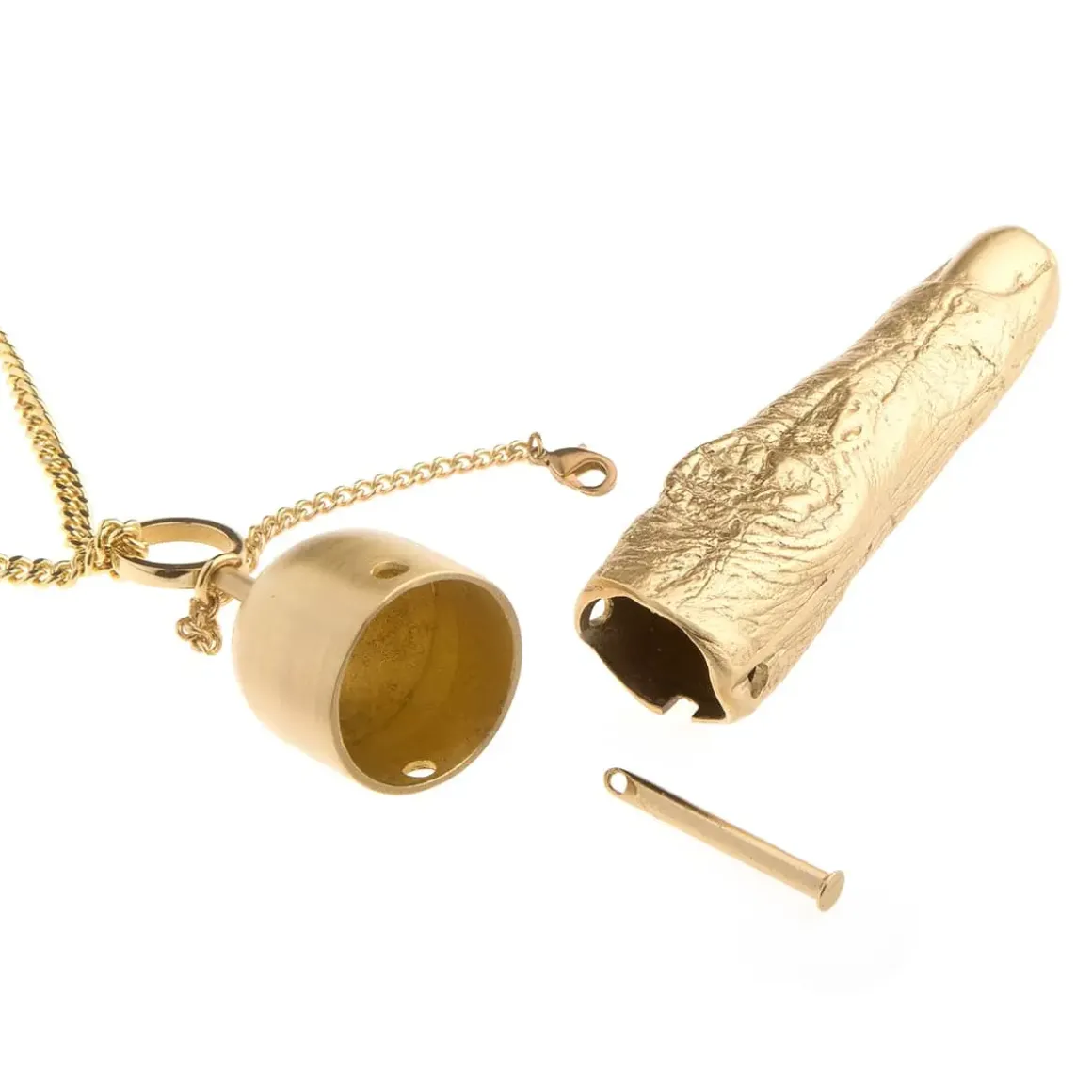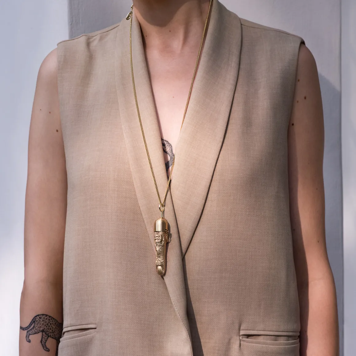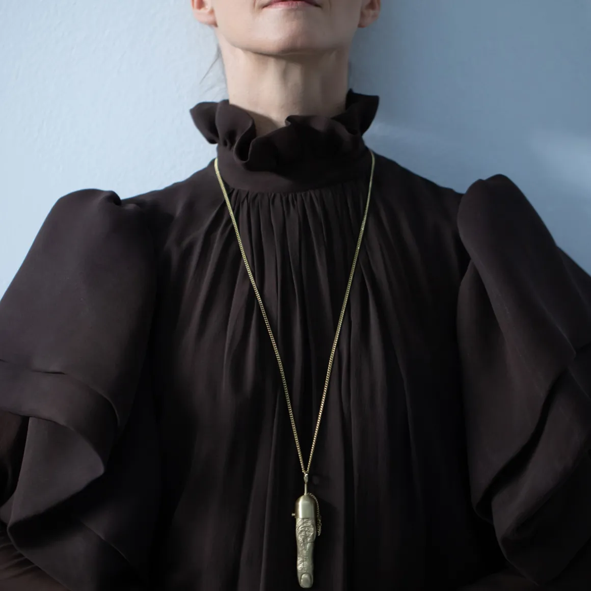Biżuteria z kolekcji Body projektu Anny Orskiej wymaga otwartości, tak jak w rzeczywistości wymaga jej ciało, którego piękno tkwi w różnorodności. Inspiracja rzadko docenianą urodą jego bardzo funkcjonalnych fragmentów znalazła swoje ujście w hiperrealistycznych, pozłacanych formach odlanych z natury. Pozłacany naszyjnik z zawieszką w kształcie palca został wykonany ręcznie. Piękno płynące z różnorodności wyeksponowane w artystycznym, jubilerskim projekcie czyni z niego ozdobę wspierającą akceptację ludzkiej fizyczności.