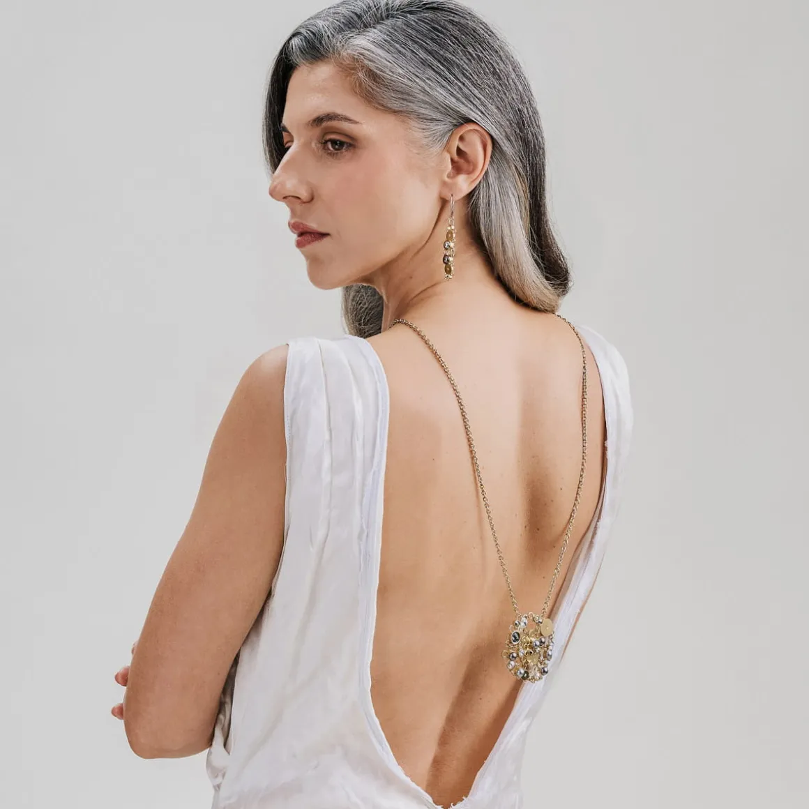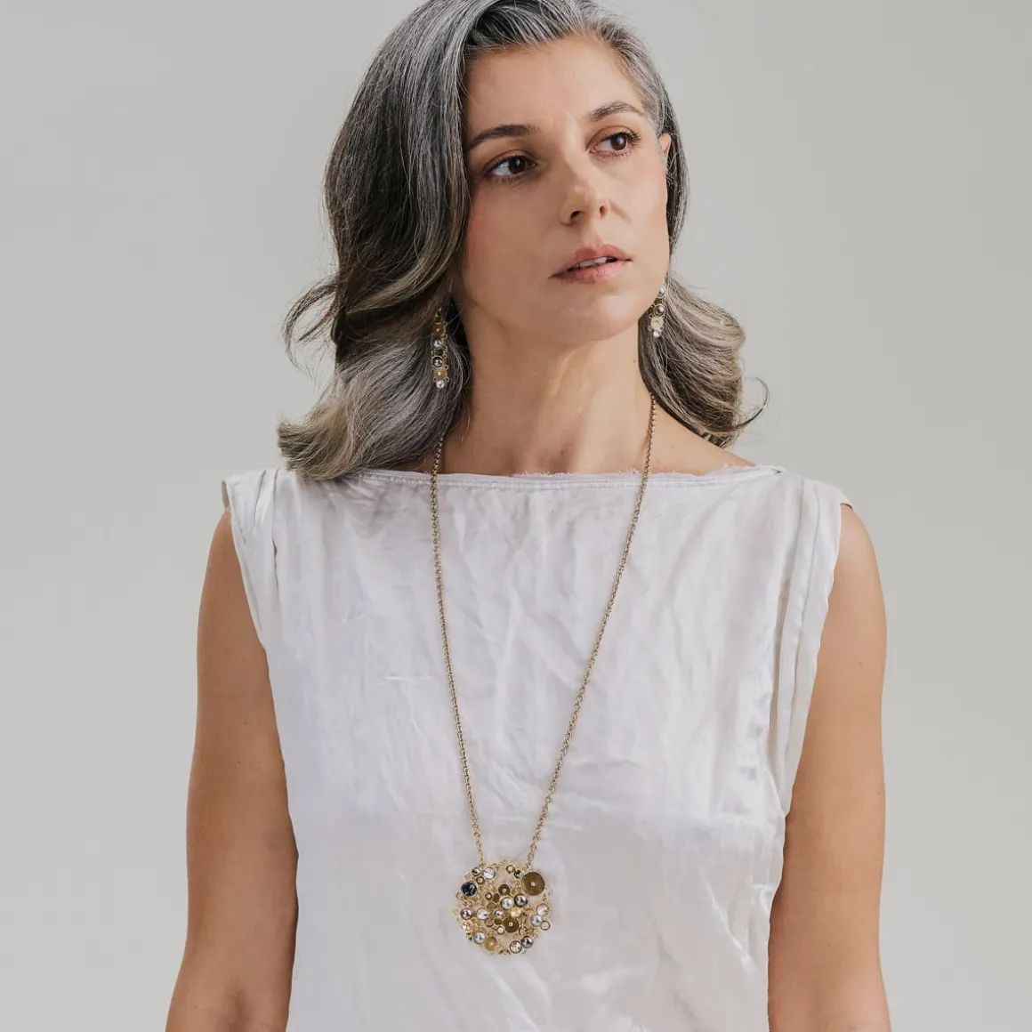 Kolekcja Soda to dyskretny flirt klasyki z nowoczesnością. Tradycyjna elegancja pereł została subtelnie przełamana współczesnymi kryształami, osadzonymi w pozłacanych elementach wykonanych w technologii druku 3D. Delikatny urok ciemnych pereł, rozświetlony kryształami, współgra z ciepłym kolorem metalu. Artystyczny naszyjnik na długim łańcuszku został wykonany ręcznie z pozłacanego mosiądzu. Efektowna biżuteria będzie idealną ozdobą dla wielbicieli nieoczywistych rozwiązań, spragnionych unikalnych doznań estetycznych.